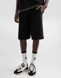 The DNA Men's Collection reimagines daily wear with bold contrasts, meticulous details, and innovative silhouettes. Outerwear stands out with clean lines and high-tech materials, merging sportiness with sophistication in sweaters, sweatshirts, and trousers. A striking color palette, including Black Sicily, caramel, cream, burgundy, and stone gray, pairs with iconic prints like Leopard and Polka dots, enhancing the collection's authentic and refined look. Cotton jersey jogging shorts with DG logo patch: • Burgundy • Oversize fit • Stretch waistband with drawstring and branded metal aglets • Front slant pockets and back pocket • The item measures 63 cm on the outer leg and the hem is 37 cm wide on a size IT 48 • Made in Italy External composition: 100% Cotton
