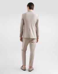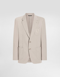 The Italian Holiday Men's Collection revisits 1950s style with a blend of relaxed fits and modern flair. Classic white shirts and tailored suits in refined fabrics contrast with casual denim and playful T-shirts featuring retro graphics with a futuristic twist. Bold prints—chessboards, cats, elegant lighters, and Mediterranean blue ribbons—alongside logo jacquard inspired by ties, infuse a contemporary edge into the essence of Italian holidays. Tailored single-breasted stretch jersey jacket with tonal DG logo embroidery: • Beige • Portofino fit • Notched lapels • Button fastenings on the front • Outer flap pockets and breast pocket, inner welt pockets • Buttoned cuffs • Central vent • Unlined • The piece measures 70 cm from the rear collar seam on a size IT 48 • Made in Italy External composition: 52% Cotton 40% Polyamide 8% Spandex Internal composition: 55% Polyester 45% Viscose