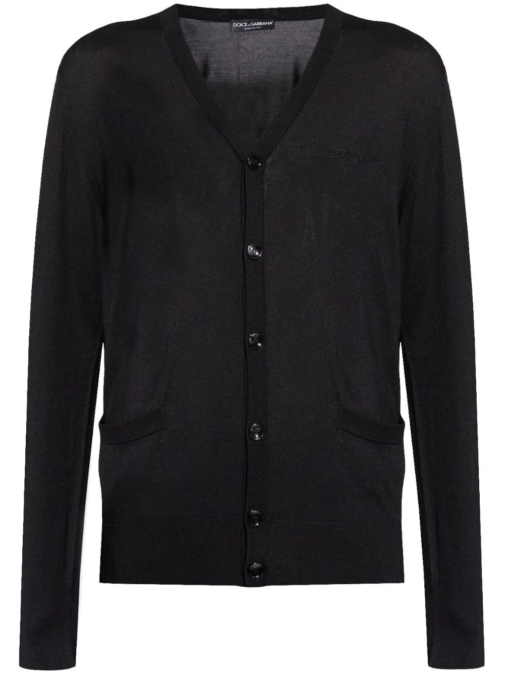 logo-embroidered cardigan Highlights - Black - Silk - Embroidered logo at the chest - V-neck - Long sleeves - Front button fastening - Two side welt pockets - Ribbed cuffs and hem Made in Italy Composition Silk 100%