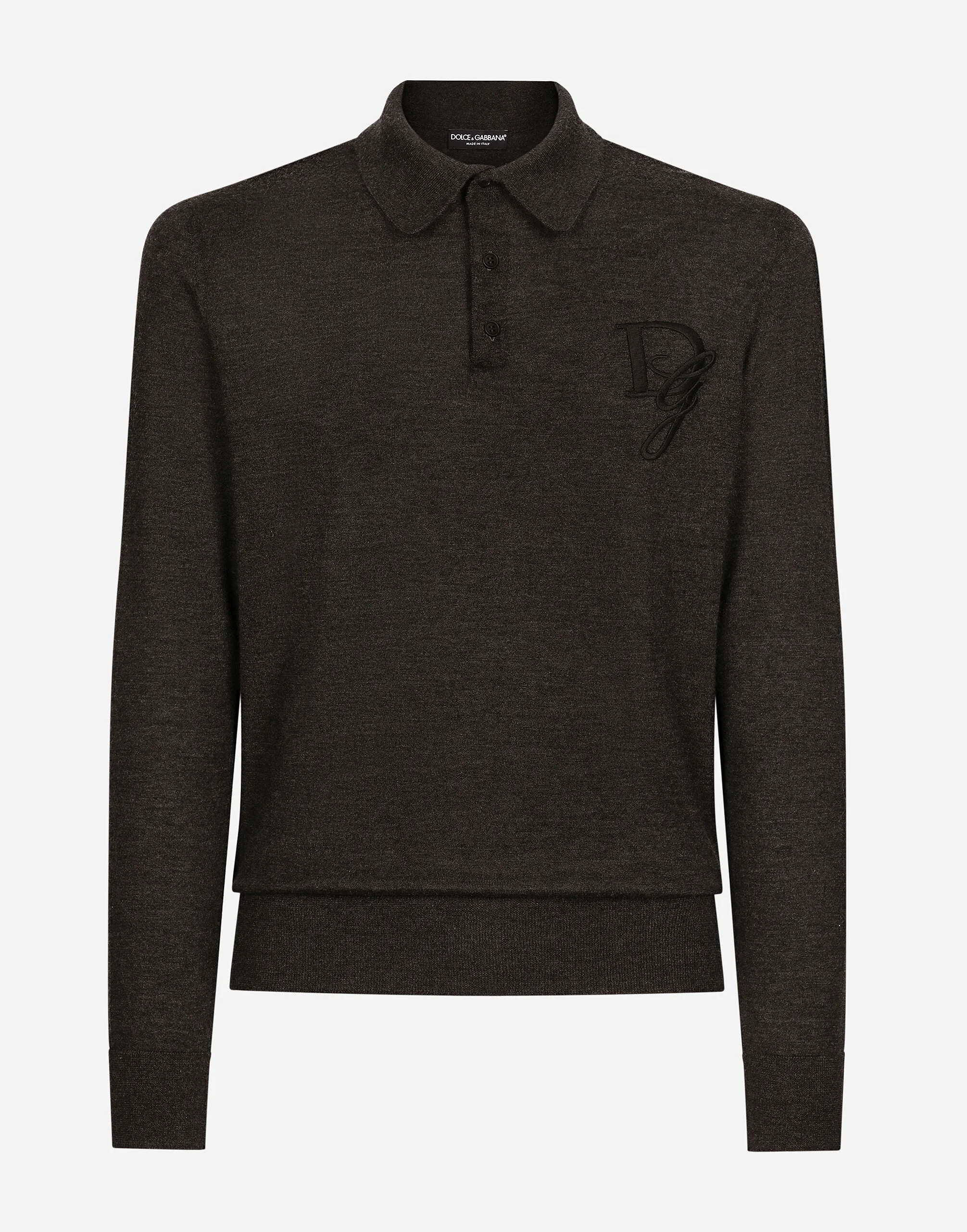 Contemporary men’s formalwear: The FW 24/25 Dolce&Gabbana Men’s Collection is embracing the concept of absolute elegance dominated by the iconic Nero Sicilia black. The daywear of the Dolce&Gabbana man comes to life through the outerwear that comes in a range of lengths and the slim-fit pants. For nightwear, the look becomes scintillating thanks to sequined embellishment and stone appliques. This refined taste can also be seen on the accessories, such as on the slip-ons with hand-applied organza flower accent and the new clutch. Cashmere polo-shirt with embroidered DG logo: • Gray • Regular fit • Enameled button fastenings • Long sleeves • 18-gauge plain knit • The piece measures 68 cm from the shoulder seam on a size IT 48 • Made in Italy External composition: 100% Cashmere