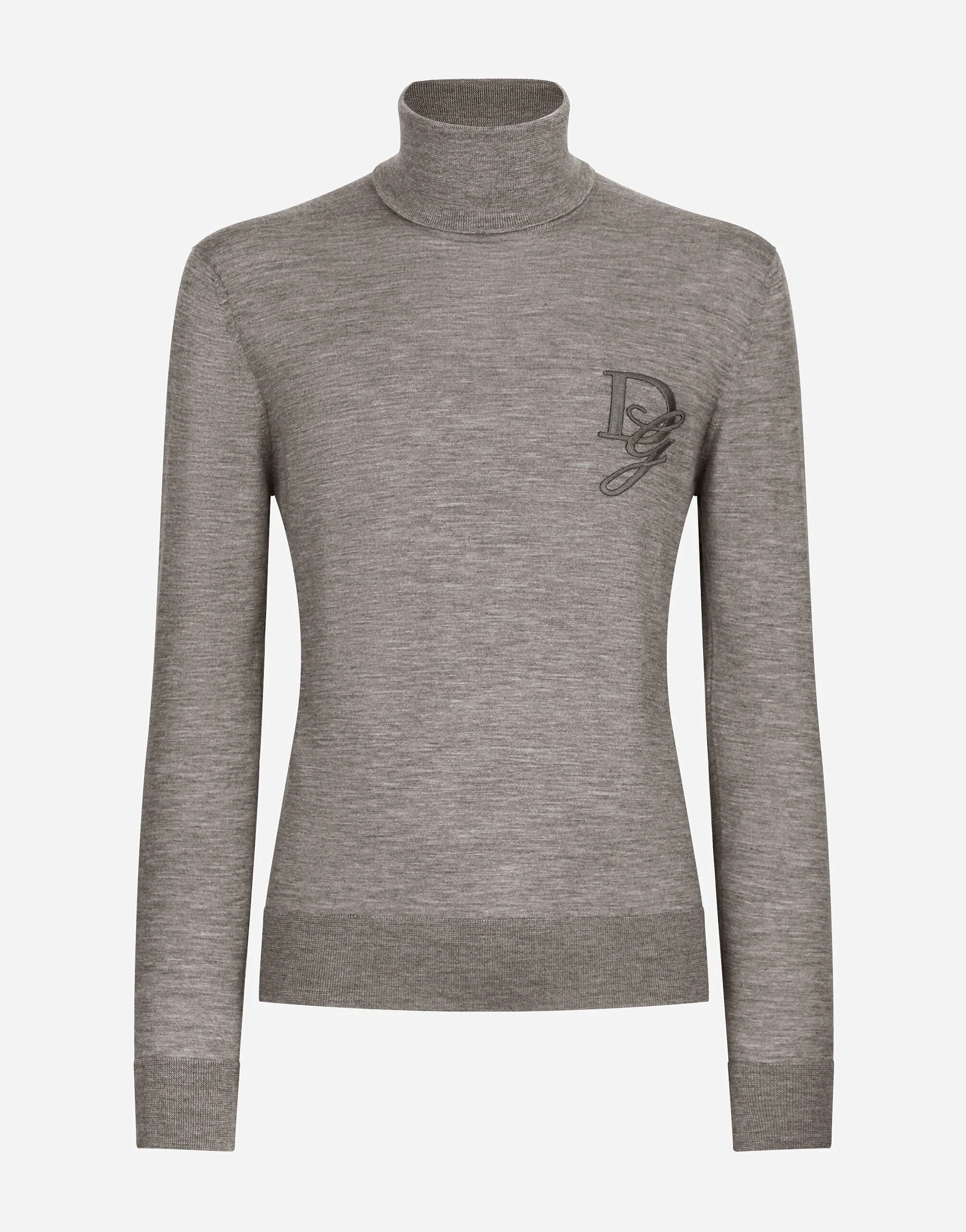 Contemporary men’s formalwear: The FW 24/25 Dolce&Gabbana Men’s Collection is embracing the concept of absolute elegance dominated by the iconic Nero Sicilia black. The daywear of the Dolce&Gabbana man comes to life through the outerwear that comes in a range of lengths and the slim-fit pants. For nightwear, the look becomes scintillating thanks to sequined embellishment and stone appliques. This refined taste can also be seen on the accessories, such as on the slip-ons with hand-applied organza flower accent and the new clutch. Cashmere turtle-neck sweater with DG logo embroidery: • Gray • Regular fit • Long sleeves • Fine-rib sleeve trims and neck • 18-gauge plain knit • The piece measures 69 cm from the shoulder seam on a size IT 48 • Made in Italy External composition: 100% Cashmere