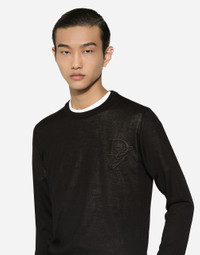 Contemporary men’s formalwear: The FW 24/25 Dolce&Gabbana Men’s Collection is embracing the concept of absolute elegance dominated by the iconic Nero Sicilia black. The daywear of the Dolce&Gabbana man comes to life through the outerwear that comes in a range of lengths and the slim-fit pants. For nightwear, the look becomes scintillating thanks to sequined embellishment and stone appliques. This refined taste can also be seen on the accessories, such as on the slip-ons with hand-applied organza flower accent and the new clutch. Cashmere round-neck sweater with DG embroidery: • Black • Regular fit • Long sleeves • Fine-rib sleeve trims and neck • 18-gauge plain knit • The piece measures 68 cm from the shoulder seam on a size IT 48 • Made in Italy External composition: 100% Cashmere