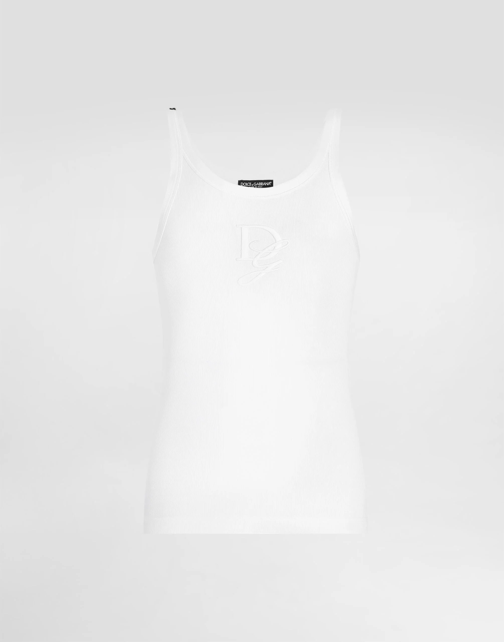 The Italian Holiday Men's Collection revisits 1950s style with a blend of relaxed fits and modern flair. Classic white shirts and tailored suits in refined fabrics contrast with casual denim and playful T-shirts featuring retro graphics with a futuristic twist. Bold prints—chessboards, cats, elegant lighters, and Mediterranean blue ribbons—alongside logo jacquard inspired by ties, infuse a contemporary edge into the essence of Italian holidays. Fine-rib narrow-shouldered cotton jersey singlet: • White • Slim fit • Round neckline • Tonal DG embroidery • The piece measures 59 cm from the rear collar seam on a size IT 48 • Made in Italy External composition: 100% Cotton