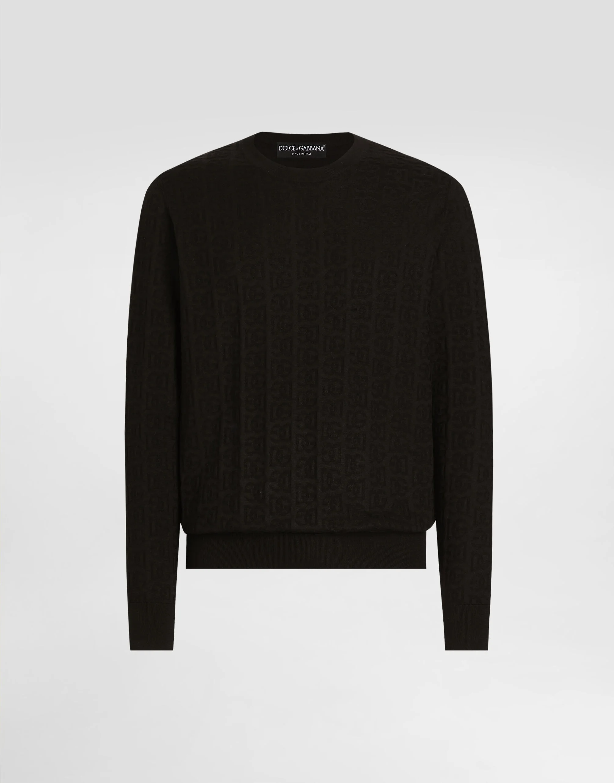 The DNA Men's Collection reimagines daily wear with bold contrasts, meticulous details, and innovative silhouettes. Outerwear stands out with clean lines and high-tech materials, merging sportiness with sophistication in sweaters, sweatshirts, and trousers. A striking color palette, including Black Sicily, caramel, cream, burgundy, and stone gray, pairs with iconic prints like Leopard and Polka dots, enhancing the collection's authentic and refined look. Silk round-neck sweater with all-over DG logo embroidery: • Black • Regular fit • Long sleeves • Fine-rib neck, sleeve trims and hem • 18-gauge plain knit • The piece measures 69 cm from the shoulder seam on a size IT 48 • Made in Italy External composition: 100% Silk