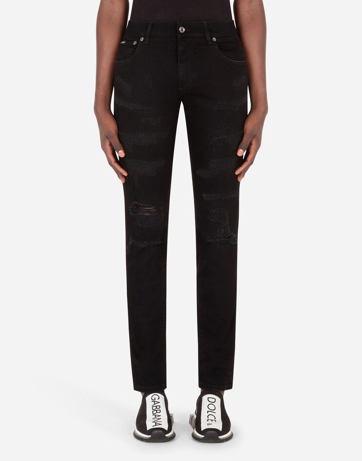 In the Dolce&Gabbana collection, our Sicilian roots and tailoring expertise mix with layering and new volume to create a sophisticated and contemporary update on our signature aesthetic. Skinny five-pocket jeans in black stretch denim with the DG logo on the back pocket: • Slim fit • Fly-covered zipper and button fastening • The crotch measures 14 cm - 5.5 inches and the hem is 16.5 cm - 6.5 inches wide on a size IT 48 • The item measures 105 cm - 41.3 inches on the outer leg on a size IT 48 • The model is 185 cm - 72.8 inches tall and wears a size IT 48 • Made in Italy Care And Details External composition: 98% Cotton 2% Spandex