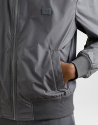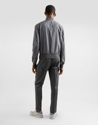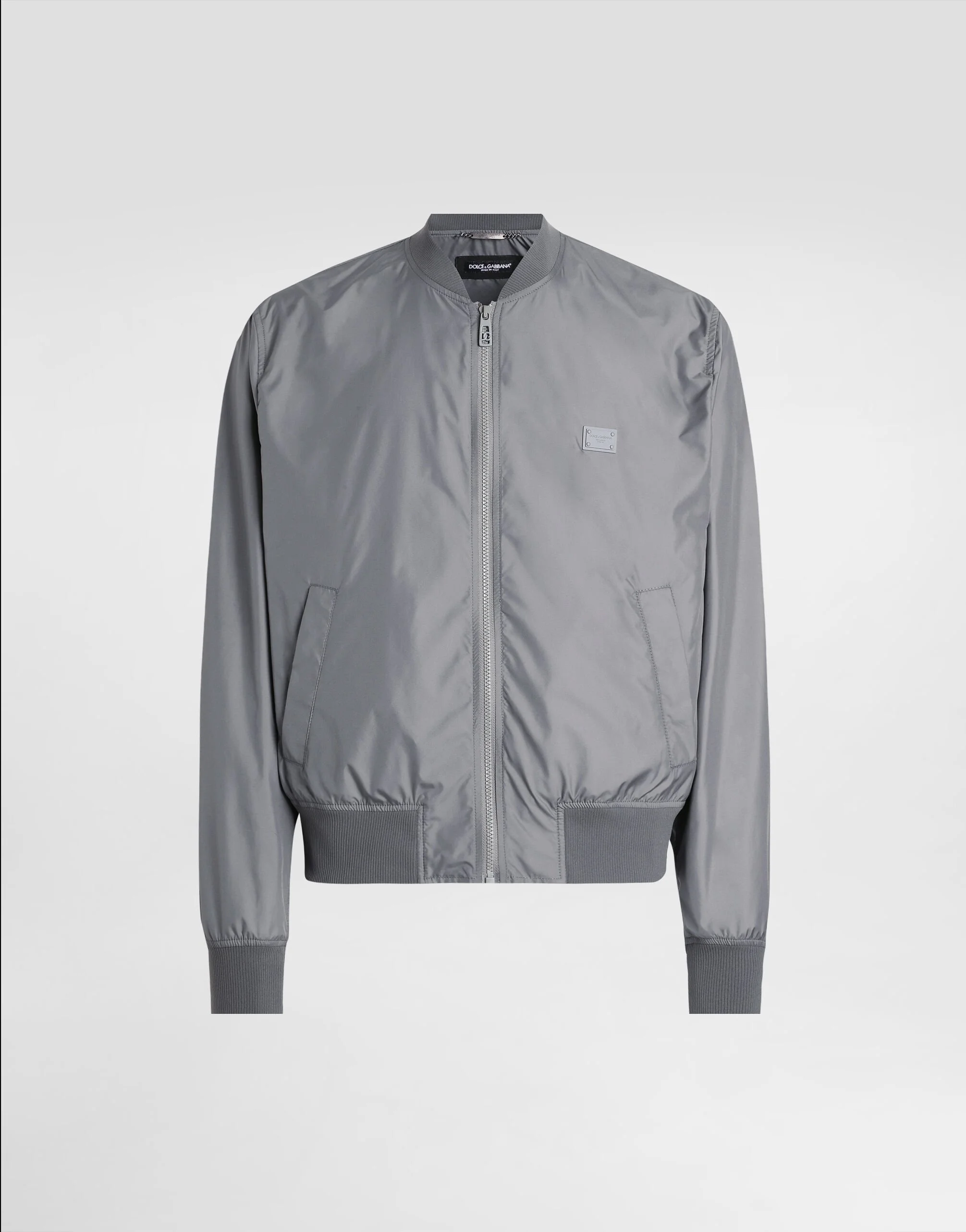 The DNA Men's Collection reimagines daily wear with bold contrasts, meticulous details, and innovative silhouettes. Outerwear stands out with clean lines and high-tech materials, merging sportiness with sophistication in sweaters, sweatshirts, and trousers. A striking color palette, including Black Sicily, caramel, cream, burgundy, and stone gray, pairs with iconic prints like Leopard and Polka dots, enhancing the collection's authentic and refined look. Technical fabric bomber jacket with rubber tag and the Dolce&Gabbana logo: • Gray • Front zipper fastening • Zipped outer pockets • Stretch knit neck, hem and sleeves • Unlined • The piece measures 63 cm from the rear collar seam on a size IT 48 • Made in Italy External composition: 100% Polyester