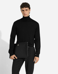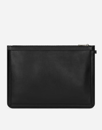 Understated and versatile, this calfskin pouch features the ruthenium-plated logo tag. Large calfskin pouch: • Black • Branded tag in ruthenium-plated metal • Top fastening with zipper and slider with logo • Fabric lining and flat pocket • Item comes with a branded dust bag • Measurements: H27 x L38 x D1 cm • Made in Italy External composition: 100% Calfskin Internal composition: 70% Cotton 20% Acrylic 10% Calfskin