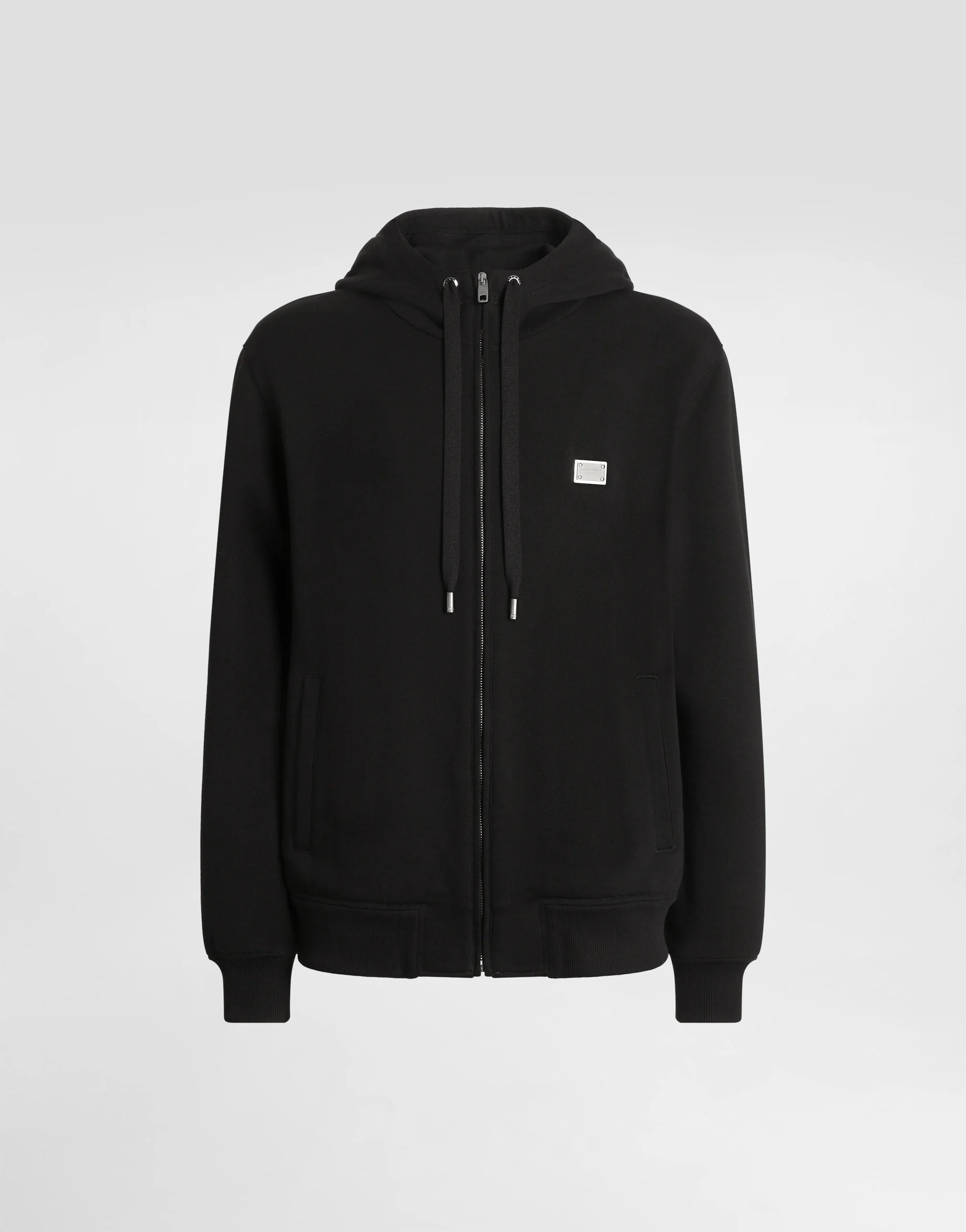 The DNA Men's Collection reimagines daily wear with bold contrasts, meticulous details, and innovative silhouettes. Outerwear stands out with clean lines and high-tech materials, merging sportiness with sophistication in sweaters, sweatshirts, and trousers. A striking color palette, including Black Sicily, caramel, cream, burgundy, and stone gray, pairs with iconic prints like Leopard and Polka dots, enhancing the collection's authentic and refined look. Cotton jersey hoodie with metal logo tag: • Black • Classic fit • Zipper and side pockets • Fine-rib neck, sleeves and hem • Long sleeves • The piece measures 73.5 cm from the shoulder seam on a size IT 48 • Made in Italy External composition: 100% Cotton Internal composition: 100% Cotton