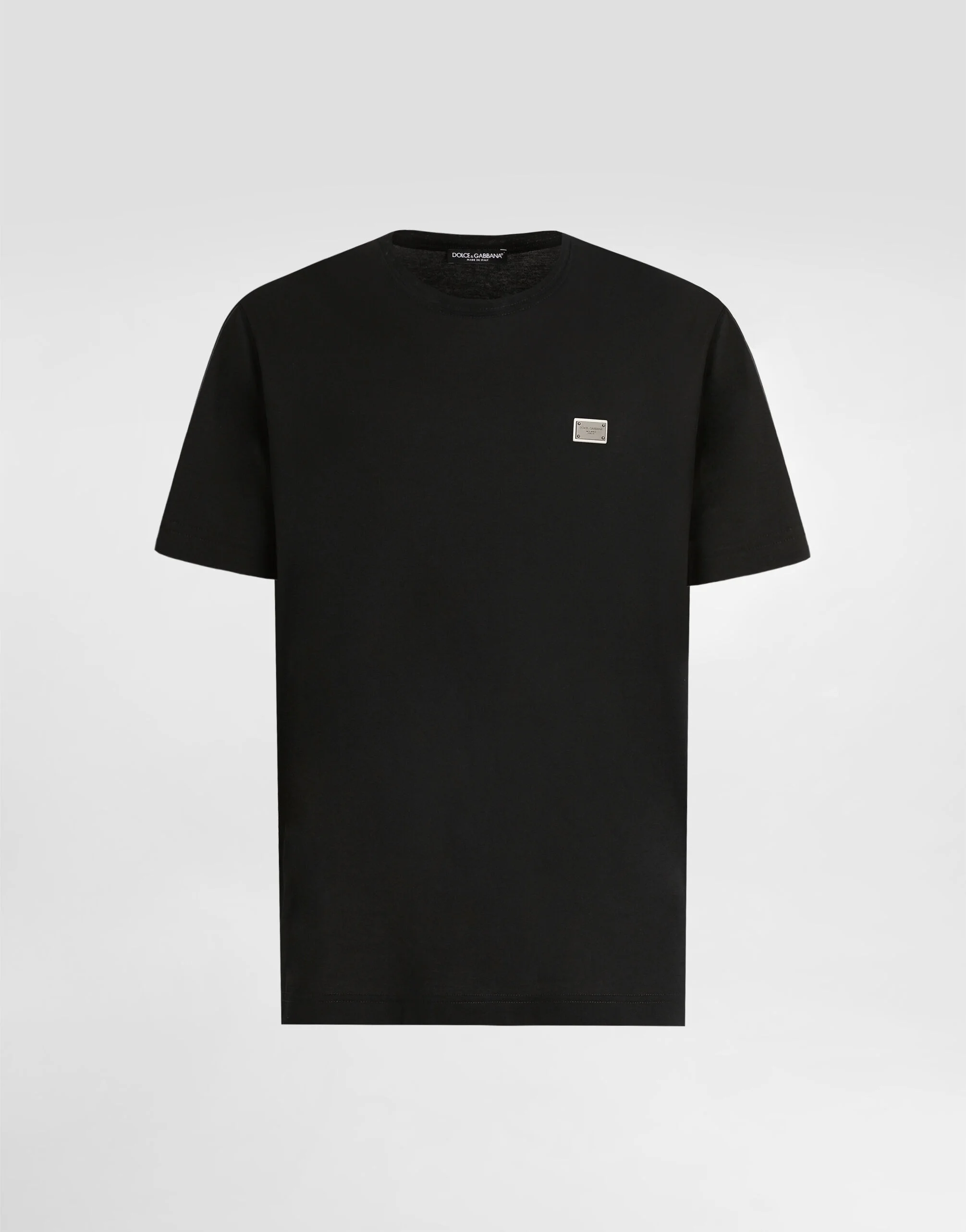 The DNA Men's Collection reimagines daily wear with bold contrasts, meticulous details, and innovative silhouettes. Outerwear stands out with clean lines and high-tech materials, merging sportiness with sophistication in sweaters, sweatshirts, and trousers. A striking color palette, including Black Sicily, caramel, cream, burgundy, and stone gray, pairs with iconic prints like Leopard and Polka dots, enhancing the collection's authentic and refined look. Cotton pique T-shirt with metal tag and logo: • Black • Regular fit • Knit neck, sleeves and hem • Short sleeves • Metal Dolce&Gabbana logo tag • The piece measures 71.5 cm from the shoulder seam on a size IT 48 • Made in Italy External composition: 100% Cotton