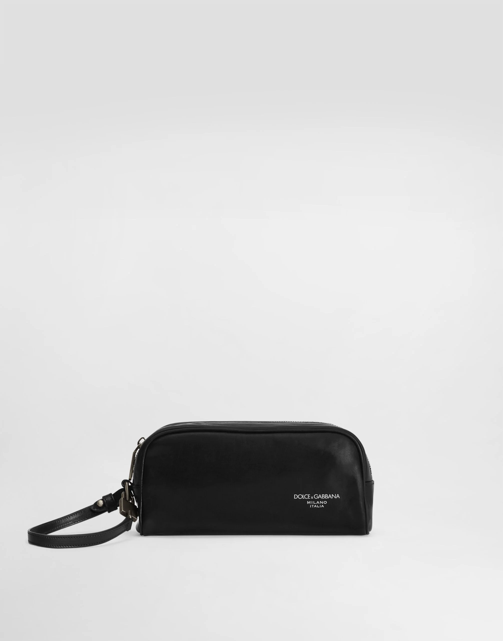 This elegant Tempesta Calfskin necessaire is the perfect accessory to organize your belongings in style. Tempesta Calfskin necessaire: • Black • Leather handle • Zip closure • Matt old titanium nickel plating • External customization with DG torchon logo • Internal customization with stamp with film • Interior with a flat pocket • Item equipped with a logo bag and logoed box • Measurements: H10 x W21 x D6 cm • Made in Italy External Composition: 100% Calfskin Internal Composition: 100% Cotton