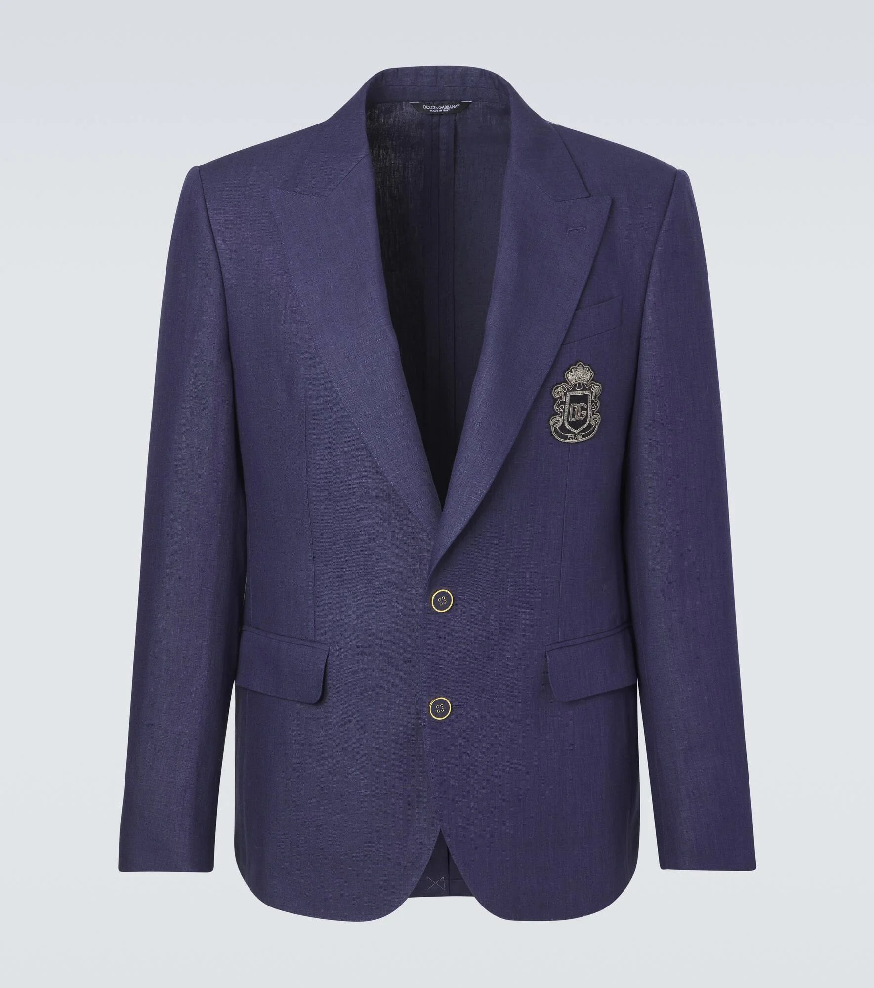 Sicilian culture is at the heart of Dolce&Gabbana's aesthetic, which attributes most of its bold styles to its Italian heritage. This single-breasted blazer is crafted from pure linen with signature crest embroidery at the chest. Product Details - Material: 100% linen - Care instructions: dry clean - Made in Italy - Color: blue - Designer color name: Navy - Lining: 100% cotton - Details: 85% brass, 5% viscose, 5% polyester, 3% cotton, 2% glass - Peak lapel - Cuff: four buttons - Pockets: breast pocket, flap pockets, internal pockets - Closure: single-breasted (two buttons) - Vent: single - Item number: P01129740 Size & Fit - True to size - Shoulder pad inserts - Slim fit - Non-stretchy fabric - slit length 24.0cm-9.5" - Height of model is 189cm-74.5" and wears a size IT 50