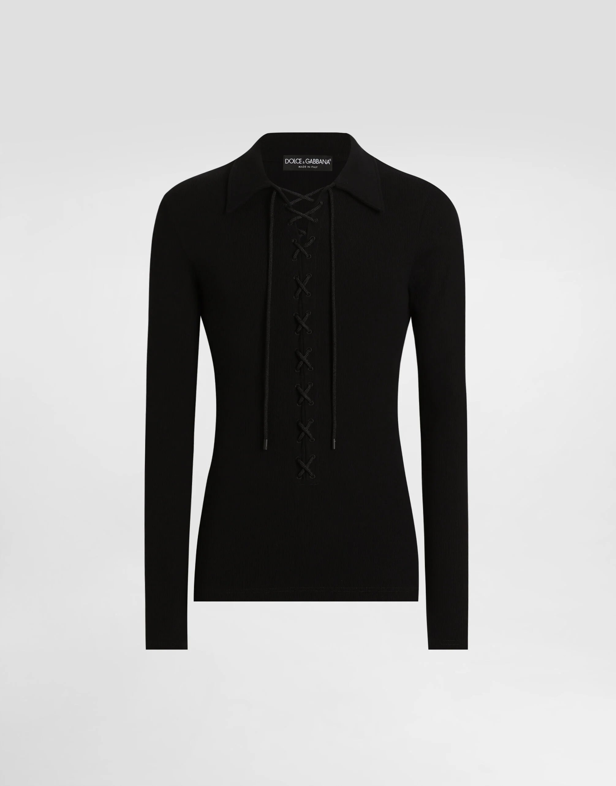 Italy and its beauty are reflected in the Men’s SS25 Collection. Woven raffia and leather give life to jackets, polo-shirts and sweaters to celebrating Italian craftsmanship. The color palette ranges from Nero Sicilia black to burgundy, contributing to conveying a sense of eternal elegance. Refined accessories complement the look: belts and loafers with hand-finished details and oversize bags, such as the Sicily, the Marlene with crocodile-effect print and the versatile Adamo tote. Long-sleeved interlock jersey polo-shirt with laces: • Black • Slim fit • Long sleeves • The piece measures 73 cm from the shoulder seam on a size IT 48 • Made in Italy External composition: 95% Cotton 5% Spandex