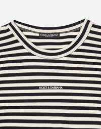 The Marina line has us dreaming of the Mediterranean sea and its myriad shades of blue, while also bringing weathered sailors to mind, yet with a contemporary edge. Aesthetic influences and clear lines, stormy sea Blue jackets, multi-pocket pieces, waterproof garments, anchor prints and materials that invite us to discover the “lighthouse keeper”. Fascinating, enigmatic and at times lonely, it tells the tale of a new masculine sensuality built with small yet precise proportions and attention to stylish detail. Striped cotton T-shirt with Dolce&Gabbana logo: • Multi-colored • Regular fit • Long sleeves • The piece measures 75 cm from the shoulder seam on a size IT 48 • Made in Italy External composition: 100% Cotton