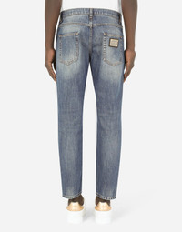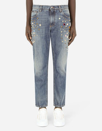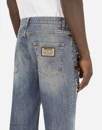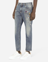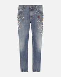 The “DG Light Therapy” fashion show is a tribute to life itself, positivity and folklore. Distinctive luminaries become wonderful photographic prints to create special, iconic pieces when combined with embroidery, crystals, sequins and jacquard designs. Five-pocket loose jeans in blue wash denim with multi-colored synthetic crystal appliqués: • Loose fit • Fly-covered zipper and button fastening • Metal Dolce&Gabbana logo plate on the back • The item measures 99 cm - 39 inches on the outer leg and the hem is 18 cm - 7.1 inches wide on a size IT 48 • The model is 185 cm - 72.8 inches tall and wears a size IT 48 • Made in Italy Care And Details External composition: 100% Cotton