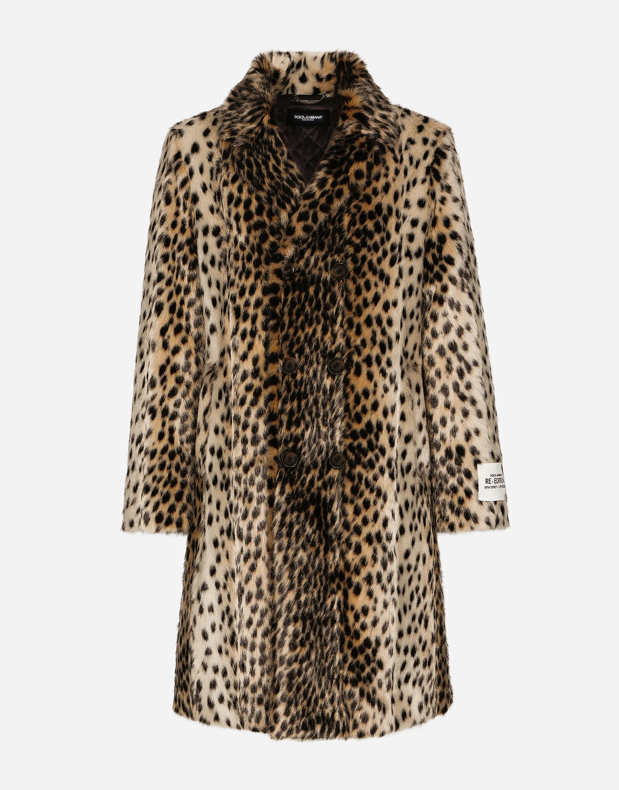 Double-breasted coat in lynx-effect jacquard faux fur with the Re-Edition label: • Animal print • Light insulated padding • Regular fit • Mirrored lapels • Button fastenings • Outer welt pockets and inner welt pockets with zipper • Quilted lining • The piece measures 105 cm from the rear collar seam on a size IT 48 • The model is 185 cm tall and wears a size IT 48 • Made in Italy Care And Details External composition: 83% Modacrylic 17% Polyester Internal composition: 100% Viscose