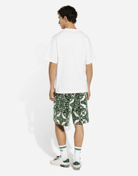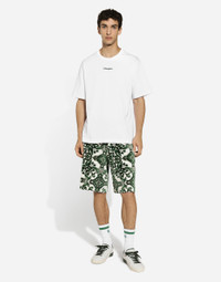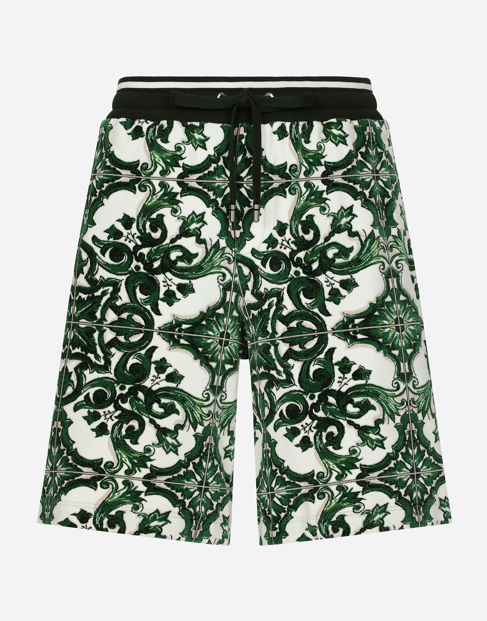Pictorial, at times volumetric with a textured effect, the decorative “calligraphic-naturalistic” majolica in solid-color green gives life to a collection distinguished by eclectic silhouettes, some stolen from the world of sports, with a cool and light vibe. The vibrant two-tone accenting – green and white – is designed to enhance a series of details, such as the pockets, the green piping paired with the white silk pajamas, the stripes on the polo-shirts, the cuffs on the shirts or the jersey inserts on the T-shirts. Chenille jogging shorts with majolica print: • Green and white • Regular fit • Stretch waistband with drawstring and branded metal aglets • Front welt pockets and back welt pocket with zipper • The item measures 62 cm on the outer leg and the hem is 37 cm wide on a size IT 48 • Made in Italy The difference in the print placement that you may find on this product is a feature of Dolce&Gabbana’s “Handmade” pieces. A detail that makes every garment or accessory unique and exclusive. External composition: 84% Cotton 16% Polyamide