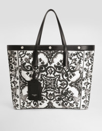 This canvas tote bag with Majolica print is a tribute to craftsmanship and creativity. Perfect for those who love to stand out with elegance. Majolica-print shopping bag in canvas: • Multi-coloured • Leather handles • Snap buttons closure • Antique palladium electroplating: • External and internal customization with stamp with film • Removable pouch • Item equipped with logoed bag and pre-assembled box • Measurements: H35.5 x L40 x D12 cm • Made in Italy The difference in the print placement that you may find on this product is a feature of Dolce&Gabbana’s “Handmade” pieces. A detail that makes every garment or accessory unique and exclusive. External Composition: 75% Cotton, 20% Calfskin, 5% PVC Internal Composition: 80% Cotton, 10% Polyester, 10% Calfskin