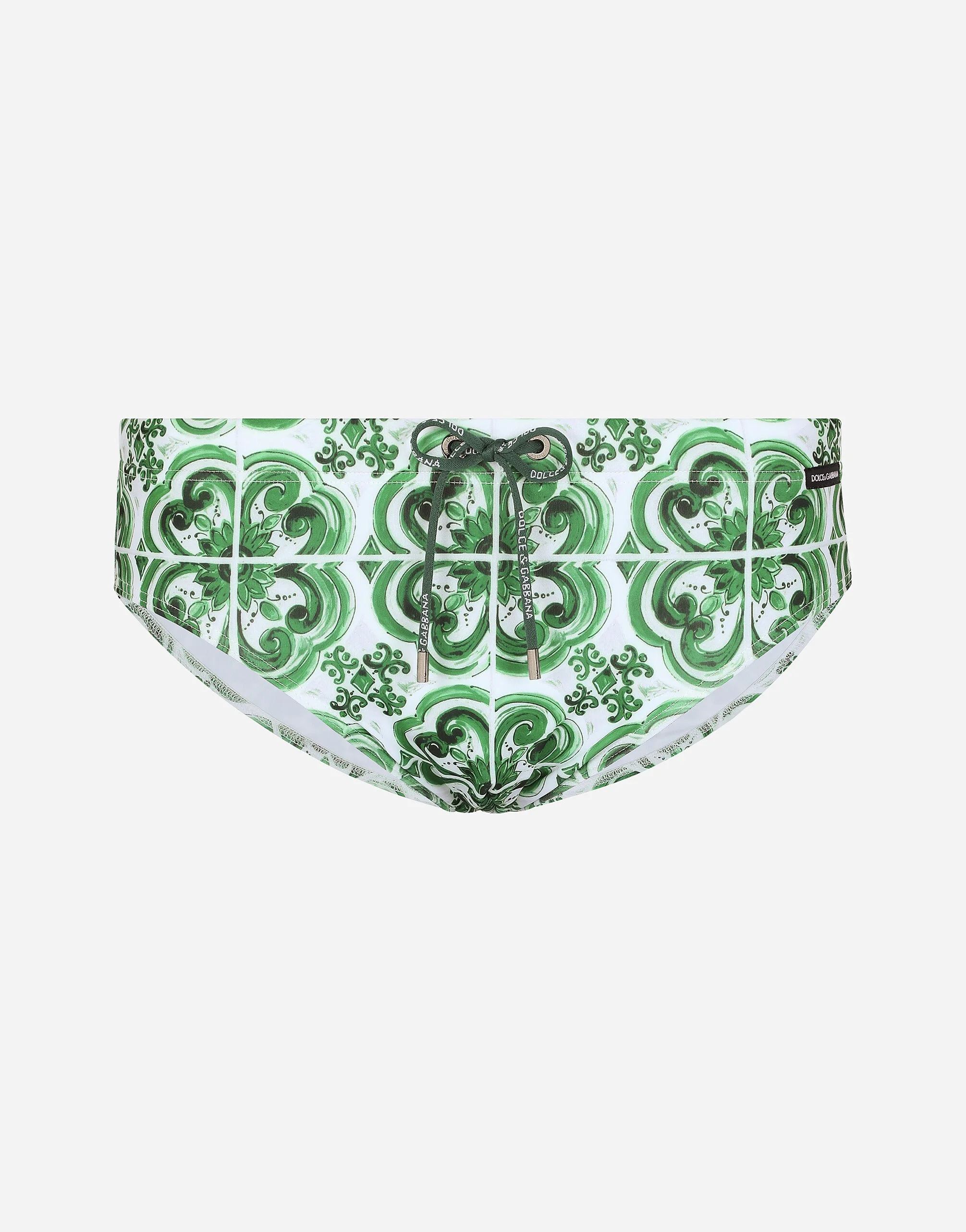 Pictorial, at times volumetric with a textured effect, the decorative “calligraphic-naturalistic” majolica in solid-color green gives life to a collection distinguished by eclectic silhouettes, some stolen from the world of sports, with a cool and light vibe. The vibrant two-tone accenting – green and white – is designed to enhance a series of details, such as the pockets, the green piping paired with the white silk pajamas, the stripes on the polo-shirts, the cuffs on the shirts or the jersey inserts on the T-shirts. Swim briefs with high-cut leg in majolica-print technical spandex fabric with Dolce&Gabbana stick label: • Green and white • Logo-detailed stretch waistband with a drawstring and nickel-free metal aglets • Matching light nylon pouch with zipper • The piece measures 29 cm on the front on a size IT 4 • Made in Italy The difference in the print placement that you may find on this product is a feature of Dolce&Gabbana’s “Handmade” pieces. A detail that makes every garment or accessory unique and exclusive. External composition: 73% Polyamide 27% Spandex