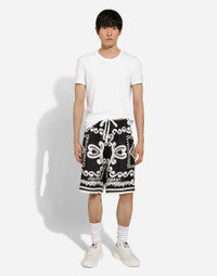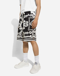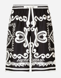 The Marina line has us dreaming of the Mediterranean sea and its myriad shades of blue, while also bringing weathered sailors to mind, yet with a contemporary edge. Aesthetic influences and clear lines, stormy sea blue jackets, multi-pocket pieces, waterproof garments, anchor prints and materials that invite us to discover the “lighthouse keeper”. Fascinating, enigmatic and at times lonely, it tells the tale of a new masculine sensuality built with small yet precise proportions and attention to stylish detail. Marina-print silk twill shorts: • Blue • Regular fit • Stretch waistband with drawstring and branded metal aglets • Front slant pockets and patch back pocket • The item measures 58 cm on the outer leg and the hem is 32 cm wide on a size IT 48 • Made in Italy The difference in the print placement that you may find on this product is a feature of Dolce&Gabbana’s “Handmade” pieces. A detail that makes every garment or accessory unique and exclusive. External composition: 100% Silk
