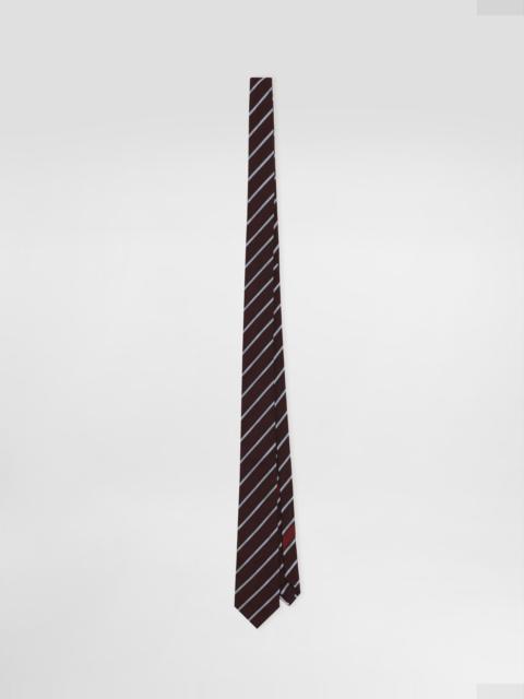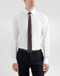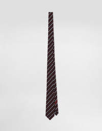 The Italian Holiday Men's Collection revisits 1950s style with a blend of relaxed fits and modern flair. Classic white shirts and tailored suits in refined fabrics contrast with casual denim and playful T-shirts featuring retro graphics with a futuristic twist. Bold prints—chessboards, cats, elegant lighters, and Mediterranean blue ribbons—alongside logo jacquard inspired by ties, infuse a contemporary edge into the essence of Italian holidays. Silk Martini tie: • Burgundy • Pointed tip • 6-cm blade • Single loop on the back with branded label • Lined • Made in Italy External composition: 100% Silk Internal composition: 100% Silk
