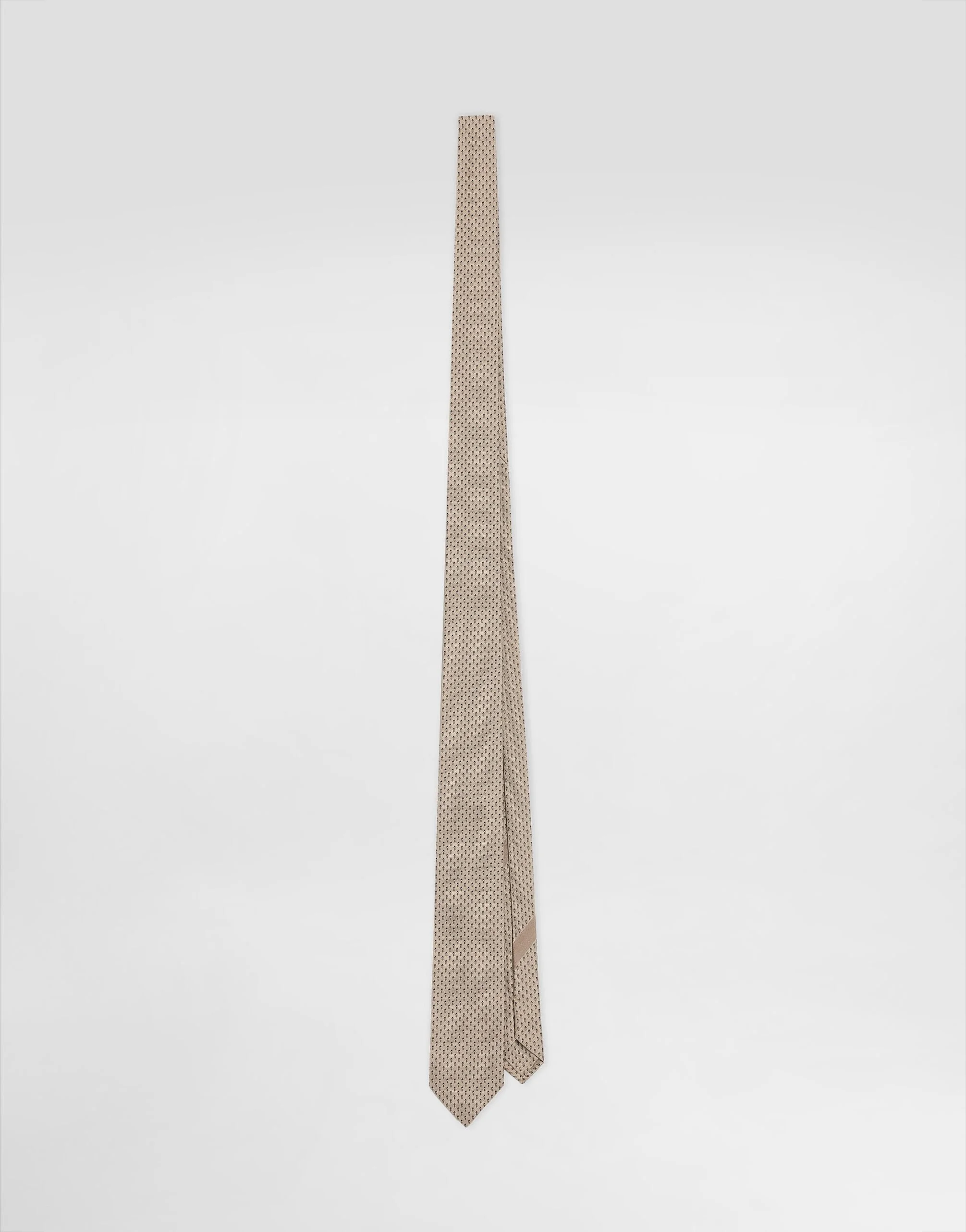 The Italian Holiday Men's Collection revisits 1950s style with a blend of relaxed fits and modern flair. Classic white shirts and tailored suits in refined fabrics contrast with casual denim and playful T-shirts featuring retro graphics with a futuristic twist. Bold prints—chessboards, cats, elegant lighters, and Mediterranean blue ribbons—alongside logo jacquard inspired by ties, infuse a contemporary edge into the essence of Italian holidays. Silk Martini tie: • Brown • Pointed tip • 6-cm blade • Single loop on the back with branded label • Lined • Made in Italy External composition: 100% Silk Internal composition: 100% Silk