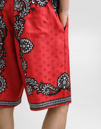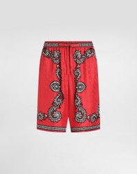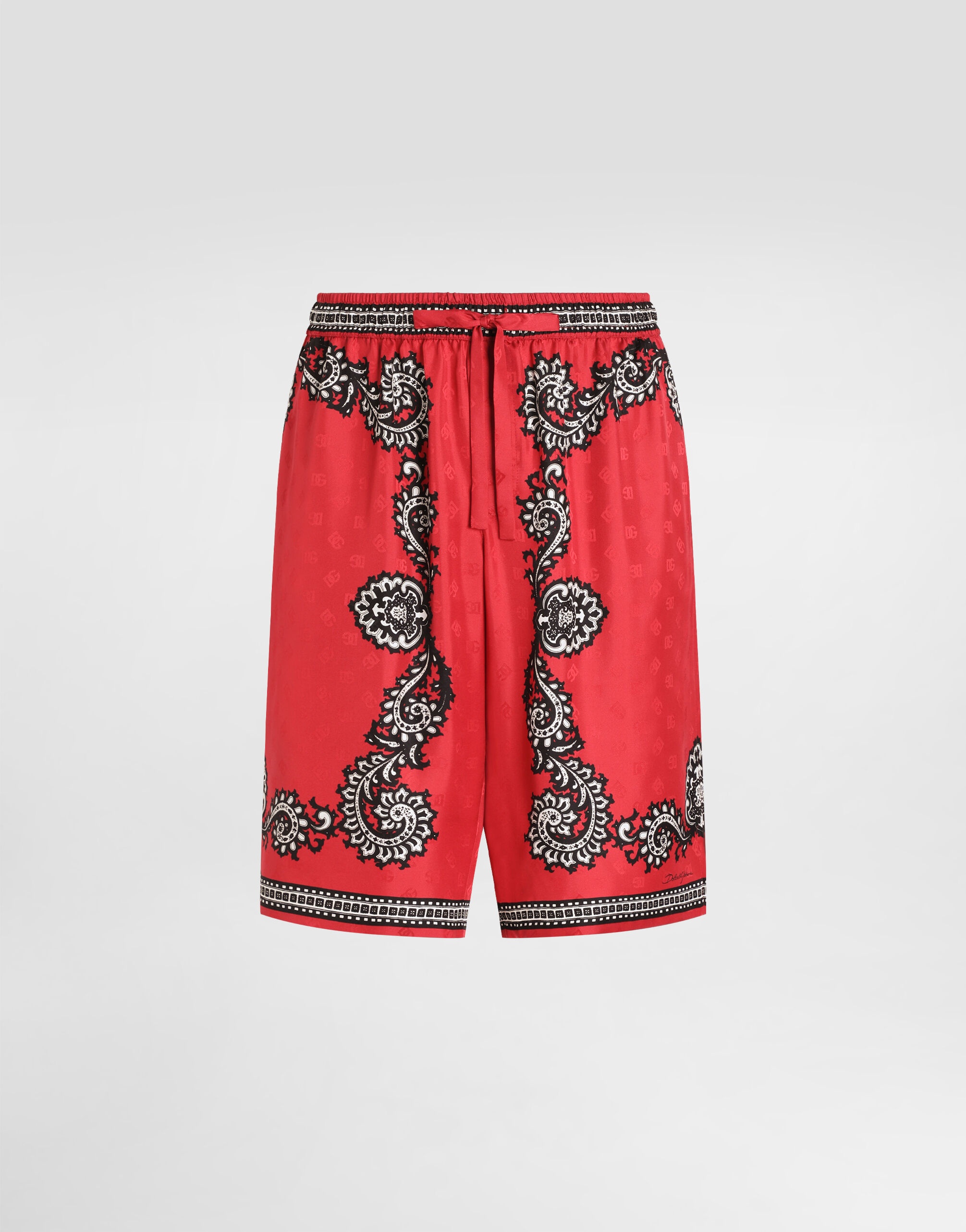 The Italian Holiday Men's Collection revisits 1950s style with a blend of relaxed fits and modern flair. Classic white shirts and tailored suits in refined fabrics contrast with casual denim and playful T-shirts featuring retro graphics with a futuristic twist. Bold prints—chessboards, cats, elegant lighters, and Mediterranean blue ribbons—alongside logo jacquard inspired by ties, infuse a contemporary edge into the essence of Italian holidays. Bandanna-print silk jacquard shorts: • Red • Regular fit • Stretch waistband with drawstring and branded metal aglets • Front slant pockets and back pocket • The item measures 58 cm on the outer leg and the hem is 32 cm wide on a size IT 48 • Made in Italy The difference in the print placement that you may find on this product is a feature of Dolce&Gabbana’s “Handmade” pieces. A detail that makes every garment or accessory unique and exclusive. External composition: 100% Silk