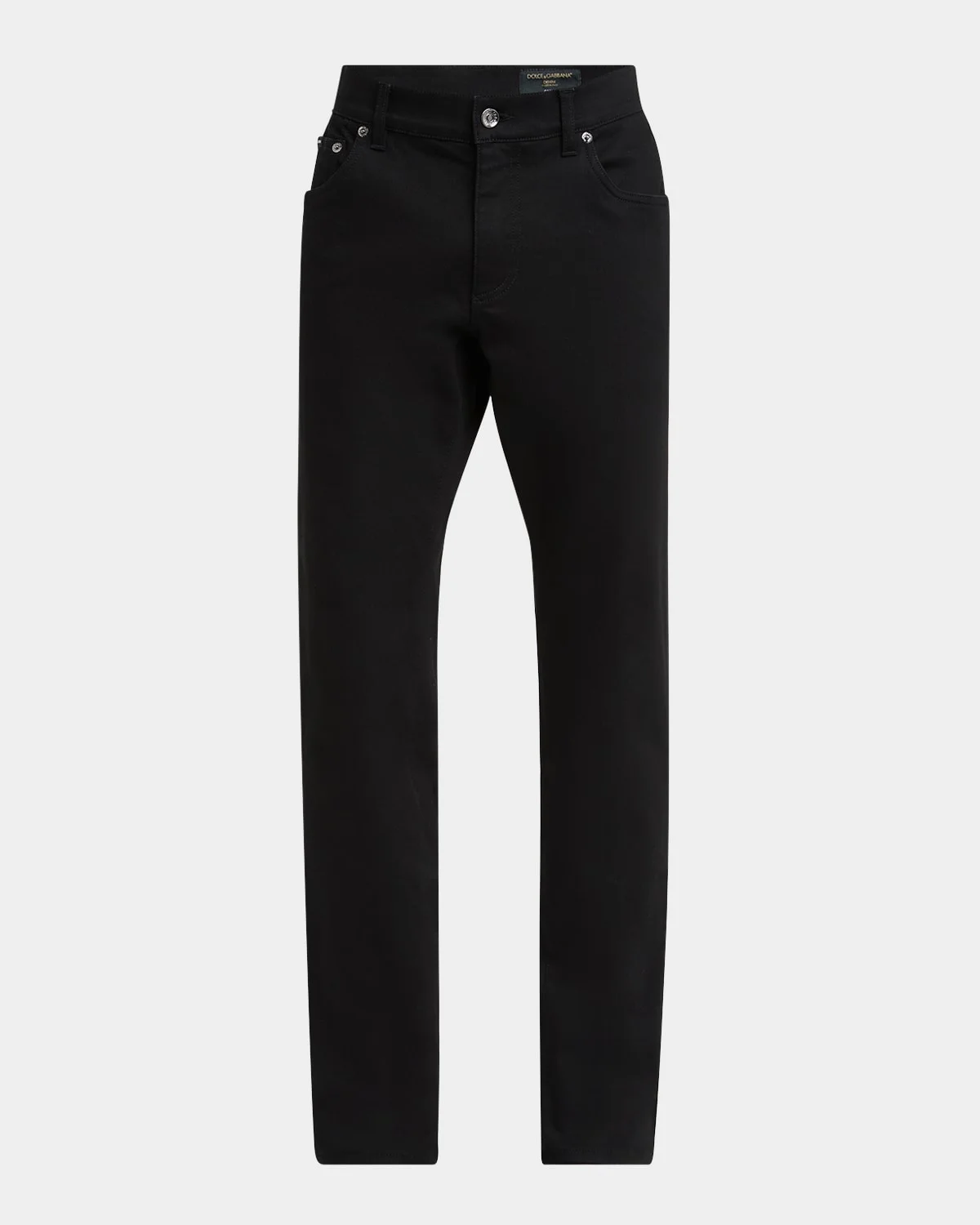 - Dolce&Gabbana pants in black denim defined by a logo plaque on the back pocket - Regular rise - Five-pocket style - Classic fit through slim legs - Full length - Button-zip fly; belt loops - Cotton/spandex - Made in Italy