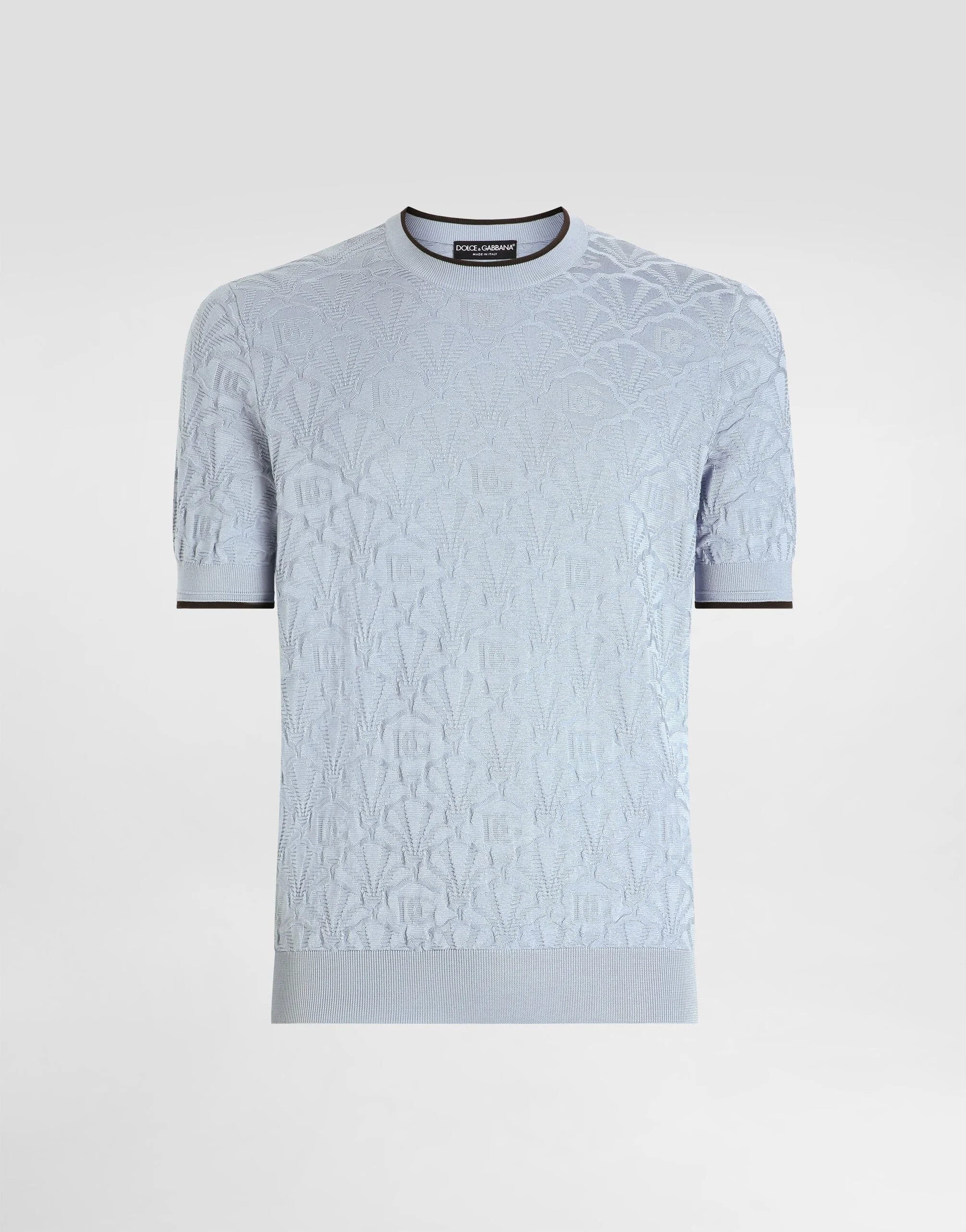 This short-sleeved crewneck pullover is a men's wardrobe essential, perfect for a casual and elegant look. Silk crewneck pullover with logo: • Blue • Crew neck • Short sleeves • The model is 185 cm tall and wears a size 48 IT • Made in Italy External Composition: 100% Silk