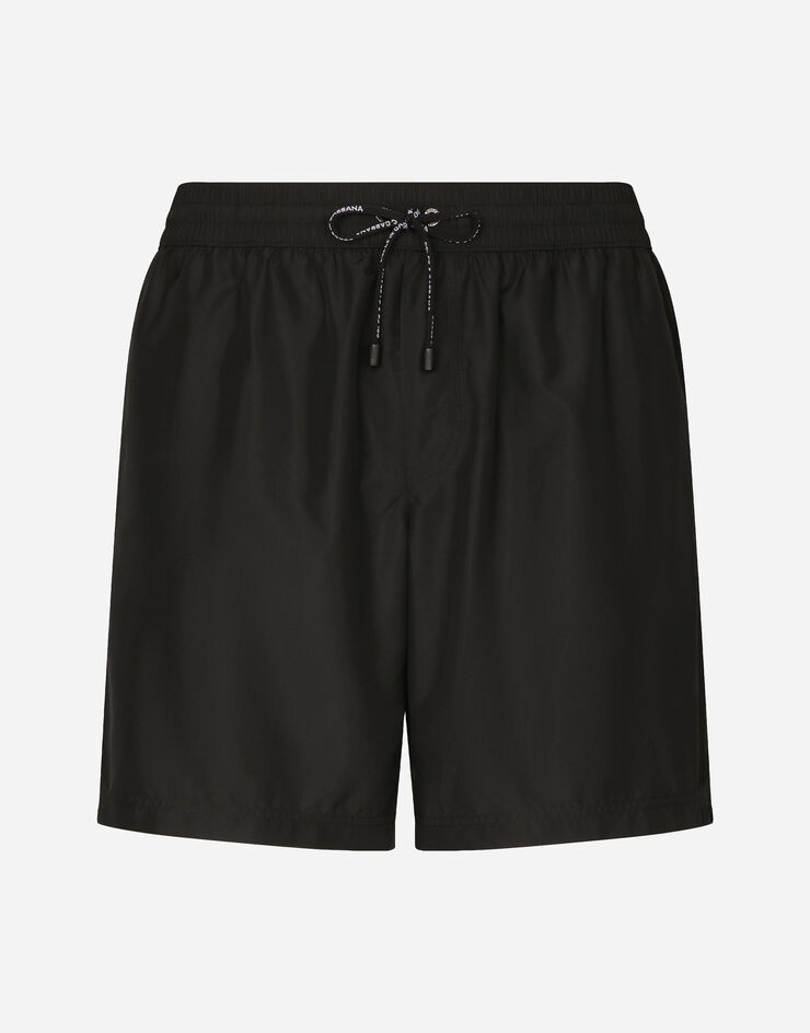Mid-length light nylon swim trunks with top-stitching and the Dolce&Gabbana stick logo label: • Logo-detailed stretch waistband with a drawstring and nickel-free metal aglets • Side pockets and small patch flap pocket on the back • Side slits • Inner briefs in soft and comfortable fabric • Matching pouch in the same fabric as the garment with zipper • Black • The item measures 38 cm on the outer leg and the hem is 28 cm wide on a size IT 4 • Made in Italy Care And Details External composition: 100% Polyester Internal composition: 84% Polyamide 16% Spandex