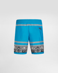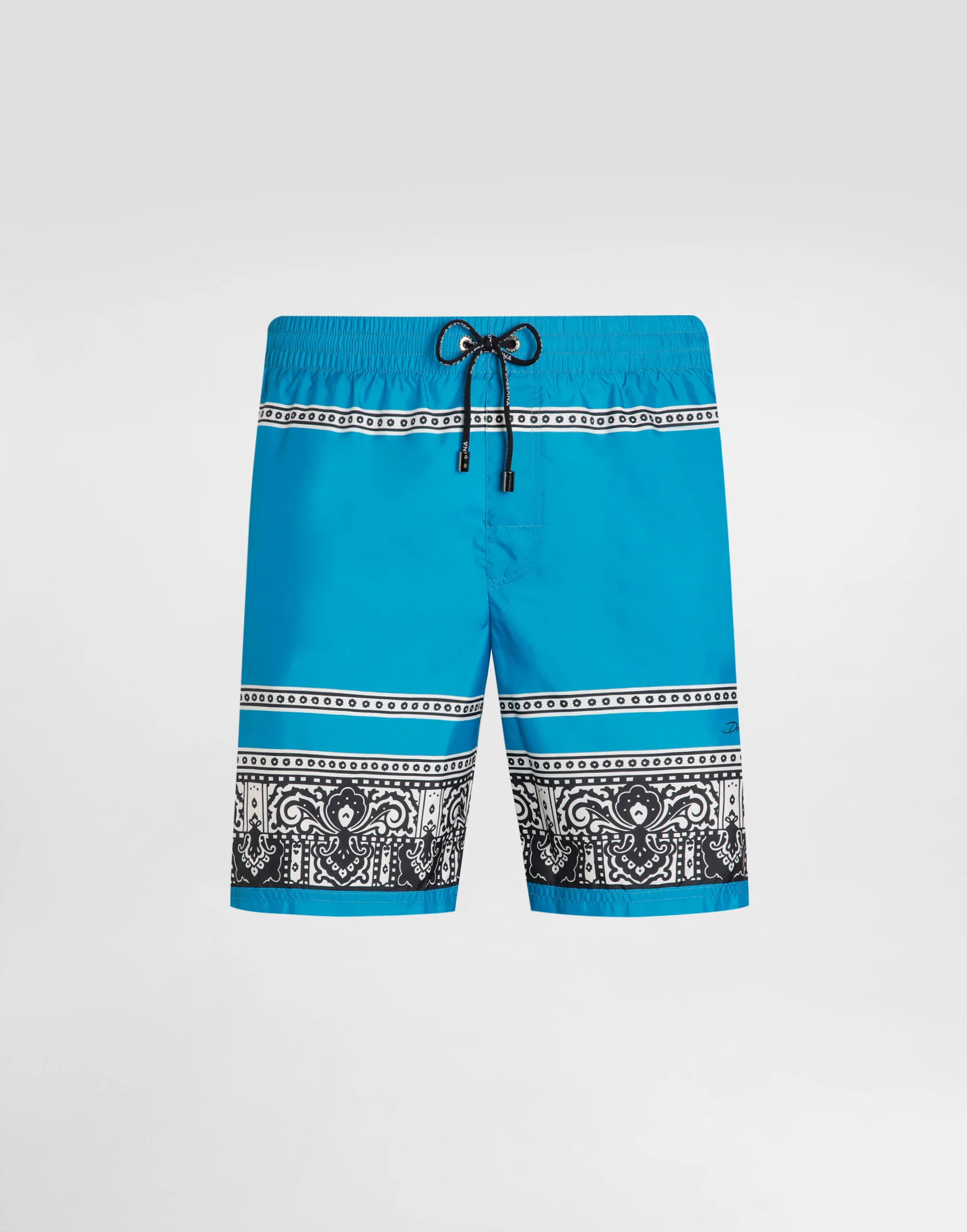 The Italian Holiday Men's Collection revisits 1950s style with a blend of relaxed fits and modern flair. Classic white shirts and tailored suits in refined fabrics contrast with casual denim and playful T-shirts featuring retro graphics with a futuristic twist. Bold prints—chessboards, cats, elegant lighters, and Mediterranean blue ribbons—alongside logo jacquard inspired by ties, infuse a contemporary edge into the essence of Italian holidays. Mid-length light nylon swim trunks with bandanna print and Dolce&Gabbana logo: • Blue • Logo-detailed stretch waistband with a drawstring and nickel-free metal aglets • Side pockets and a small zipped pocket on the back • Inner briefs in soft and comfortable fabric • Matching pouch in the same fabric as the garment with zipper • The item measures 43 cm on the outer leg on a size IT 4 • Made in Italy The difference in the print placement that you may find on this product is a feature of Dolce&Gabbana’s “Handmade” pieces. A detail that makes every garment or accessory unique and exclusive. External composition: 88% Polyamide 12% Spandex Internal composition: 100% Polyester