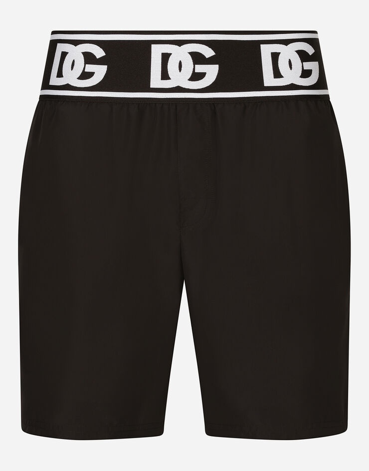 Mid-length light polyester swim trunks: • Elasticated high waist with all-over DG logo • Side pockets and a small zipped pocket on the back • Inner briefs in soft and comfortable fabric • Matching pouch in the same fabric as the garment • The item measures 47 cm on the outer leg on a size IT 4 • Sizes available: from II to VII • Made in Italy Care And Details External composition: 100% Polyester Internal composition: 85% Polyamide 15% Spandex