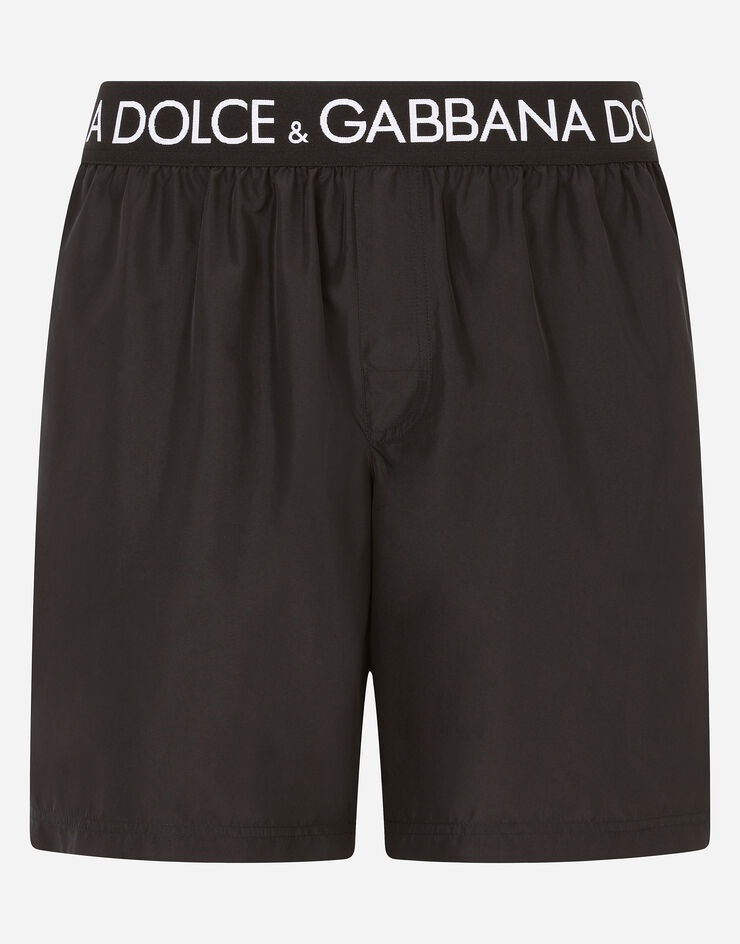 Mid-length swim trunks with branded stretch waistband