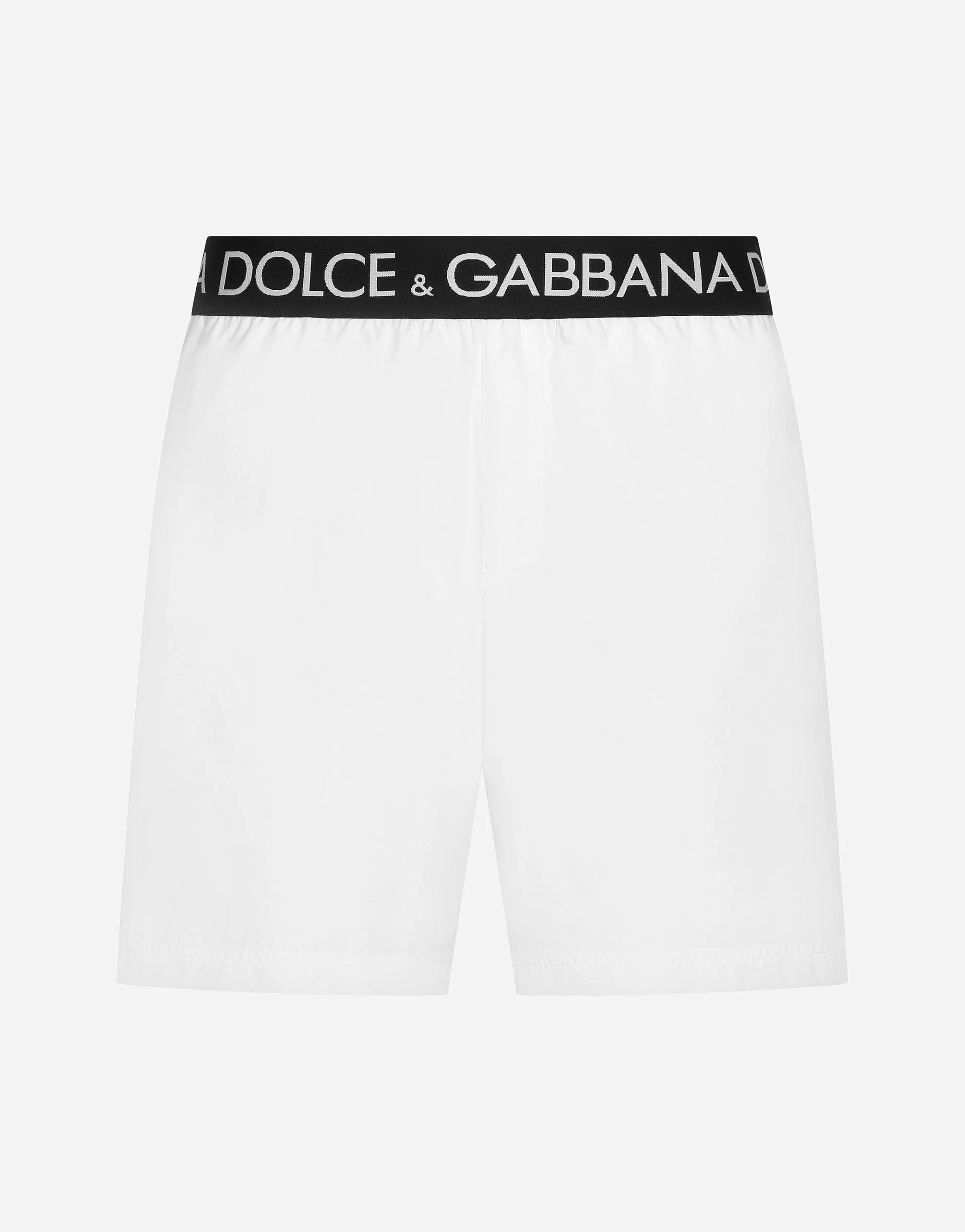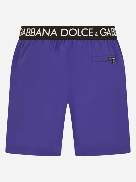Mid-length swim trunks with branded stretch waistband