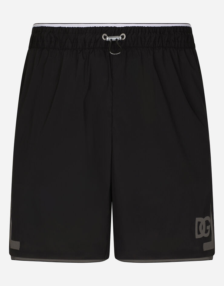 Mid-length light polyester swim trunks with DG logo patch and reflective details: • Stretch waistband with branded drawstring • Side pockets and a small zipped pocket on the back • Inner briefs in soft and comfortable fabric • Matching pouch in the same fabric as the garment • The item measures 43 cm on the outer leg on a size IT 4 • Sizes available: from II to VII • Made in Italy Care And Details External composition: 100% Polyester Internal composition: 85% Polyamide 15% Spandex