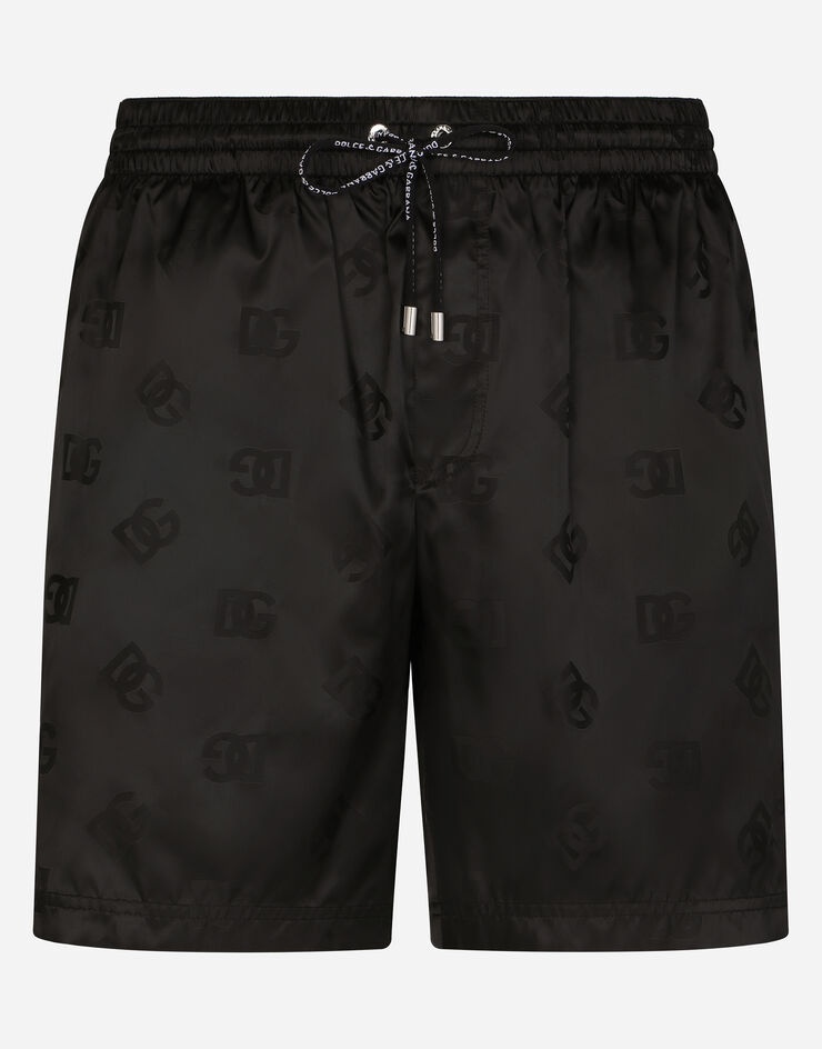 Short light technical satin swim trunks with jacquard DG Monogram: • Black • Logo-detailed stretch waistband with a drawstring and nickel-free metal aglets • Side pockets and a small zipped pocket on the back • Inner briefs in soft and comfortable fabric • Matching pouch in the same fabric as the garment • The item measures 43 cm on the outer leg and the hem is 28 cm wide on a size IT 4 • Made in Italy Care And Details External composition: 100% Polyester Internal composition: 84% Polyamide 16% Spandex