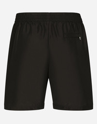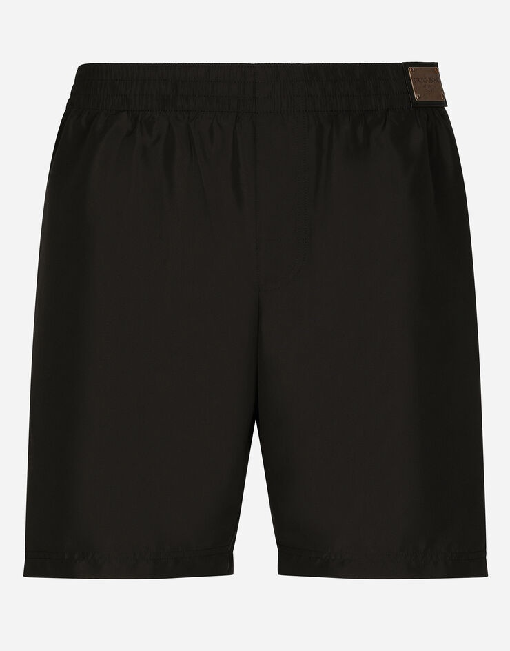 Mid-length light polyester swim trunks with metal Dolce&Gabbana logo tag: • Stretch waistband • Side pockets and a small zipped pocket on the back • Inner briefs in soft and comfortable fabric • Matching pouch in the same fabric as the garment • The item measures 43 cm on the outer leg on a size IT 4 • Sizes available: from II to VII • Made in Italy Care And Details External composition: 100% Polyester Internal composition: 85% Polyamide 15% Spandex