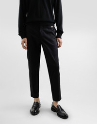 The DNA Men's Collection reimagines daily wear with bold contrasts, meticulous details, and innovative silhouettes. Outerwear stands out with clean lines and high-tech materials, merging sportiness with sophistication in sweaters, sweatshirts, and trousers. A striking color palette, including Black Sicily, caramel, cream, burgundy, and stone gray, pairs with iconic prints like Leopard and Polka dots, enhancing the collection's authentic and refined look. Tailored stretch cotton gabardine pants: • Black • Regular fit • Belt loops on the front of the waist and elasticated rear waistband • Fly-covered zipper and button fastening • Front slant pockets and buttoned welt pockets at the back • The item measures 105 cm on the outer leg and the hem is 22 cm wide on a size IT 48 • Made in Italy External composition: 98% Cotton 2% Spandex