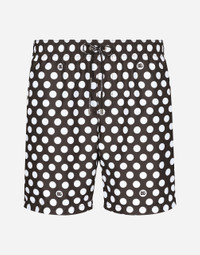 The Palermo collection represents the link between the Sicilian man’s world and the unspoiled nature of the island. A language marked by warm hues – sand, cream, Nero Sicilia black – floral paintings and iconic prints. The Dolce&Gabbana closet must-haves have been reworked in different materials, in pursuit of a new form of harmony. A collection rich in suggestion, such as the stripes inspired by the old mattresses of the 1940s and 1950s, and the timeless aesthetic of the looks. Mid-rise polka-dot-print lightweight nylon swim shorts with Dolce&Gabbana stick label: • Black • DG logo print • Logo-detailed stretch waistband with a drawstring and nickel-free metal aglets • Side pockets and a small zipped pocket on the back • Inner briefs in soft and comfortable fabric • Matching pouch in the same fabric as the garment with zipper • The item measures 43 cm on the outer leg and the hem is 28 cm wide on a size IT 4 • Made in Italy The difference in the print placement that you may find on this product is a feature of Dolce&Gabbana’s “Handmade” pieces. A detail that makes every garment or accessory unique and exclusive. External composition: 92% Polyamide 8% Spandex