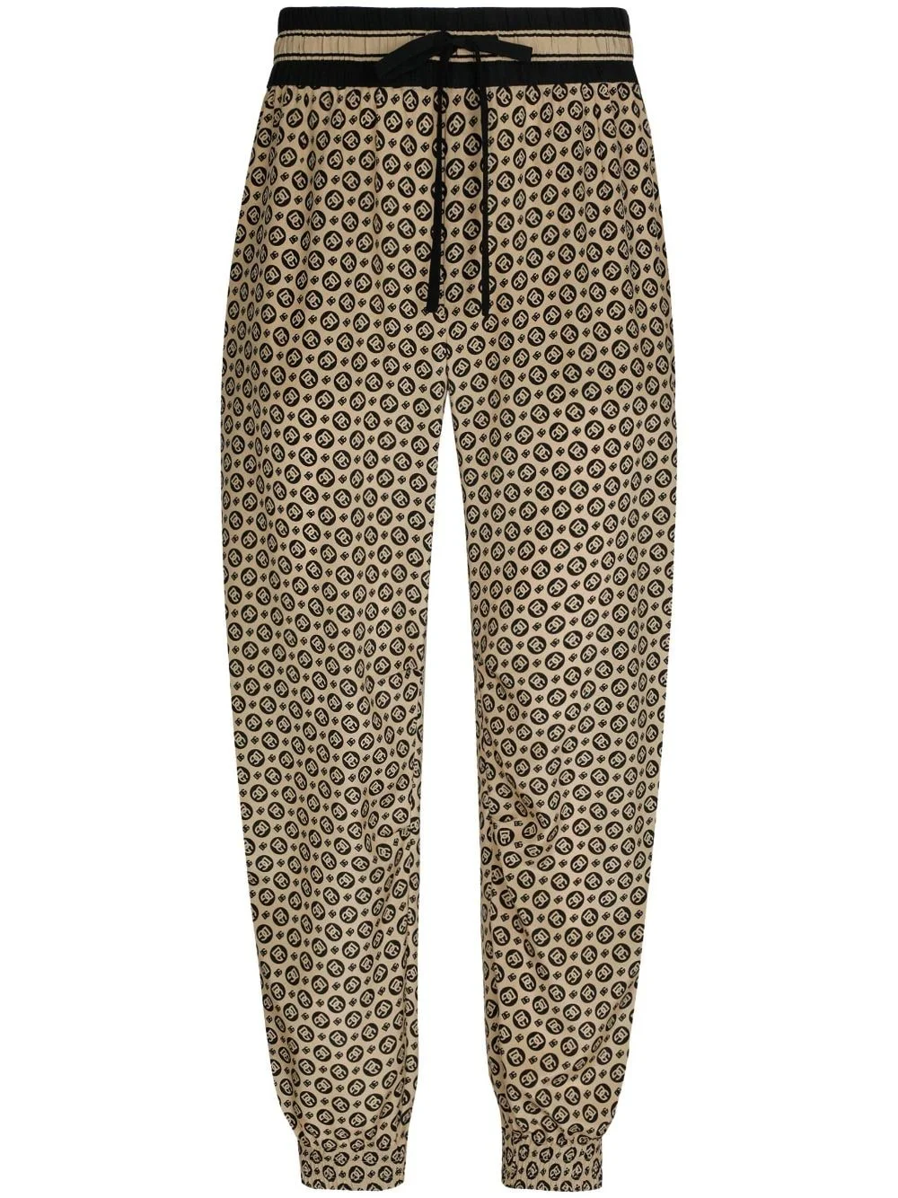 monogram-pattern print silk trousers Highlights - Camel brown - Silk crepe - Monogram pattern - Side stripe detailing - Elasticated ankles - Elasticated drawstring waistband - Two side inset pockets - Two rear welt pockets Made in Italy Composition Silk Crepe 100%