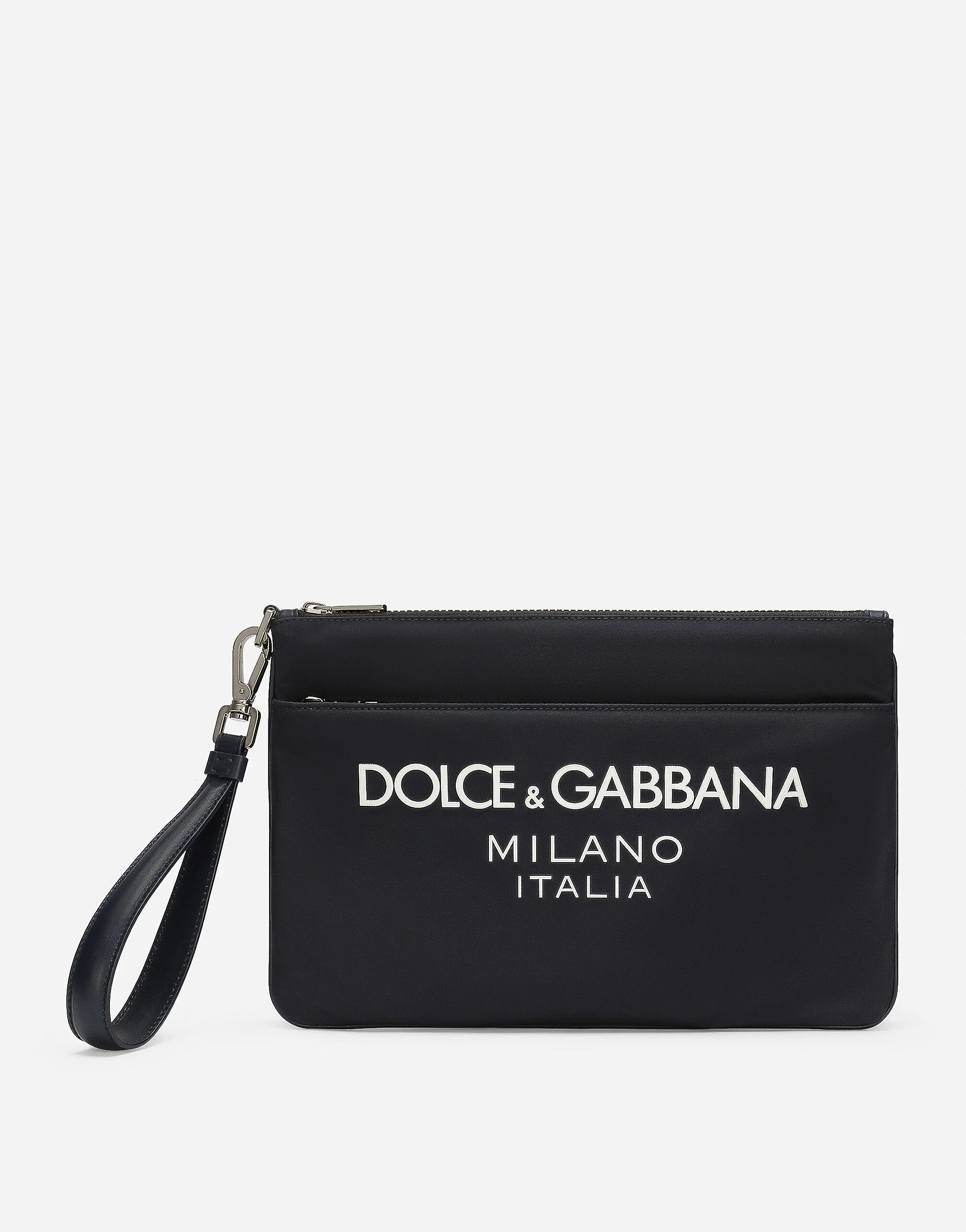 The brand’s iconic features adorn the logo. This soft nylon clutch features the Dolce&Gabbana Milano logo. Nylon clutch with rubberized Dolce&Gabbana Milano logo: • Blue • Top fastening with zipper and slider with logo • Zipped flat pocket with branded slider • Detachable calfskin strap • Nylon lining • Item comes with a branded dust bag • Measurements: H18 x W28 x D0.5 cm • Made in Italy External composition: 50% Polyamide 20% Acrylic 15% Calfskin 15% Viscose Internal composition: 85% Polyamide 15% Calfskin