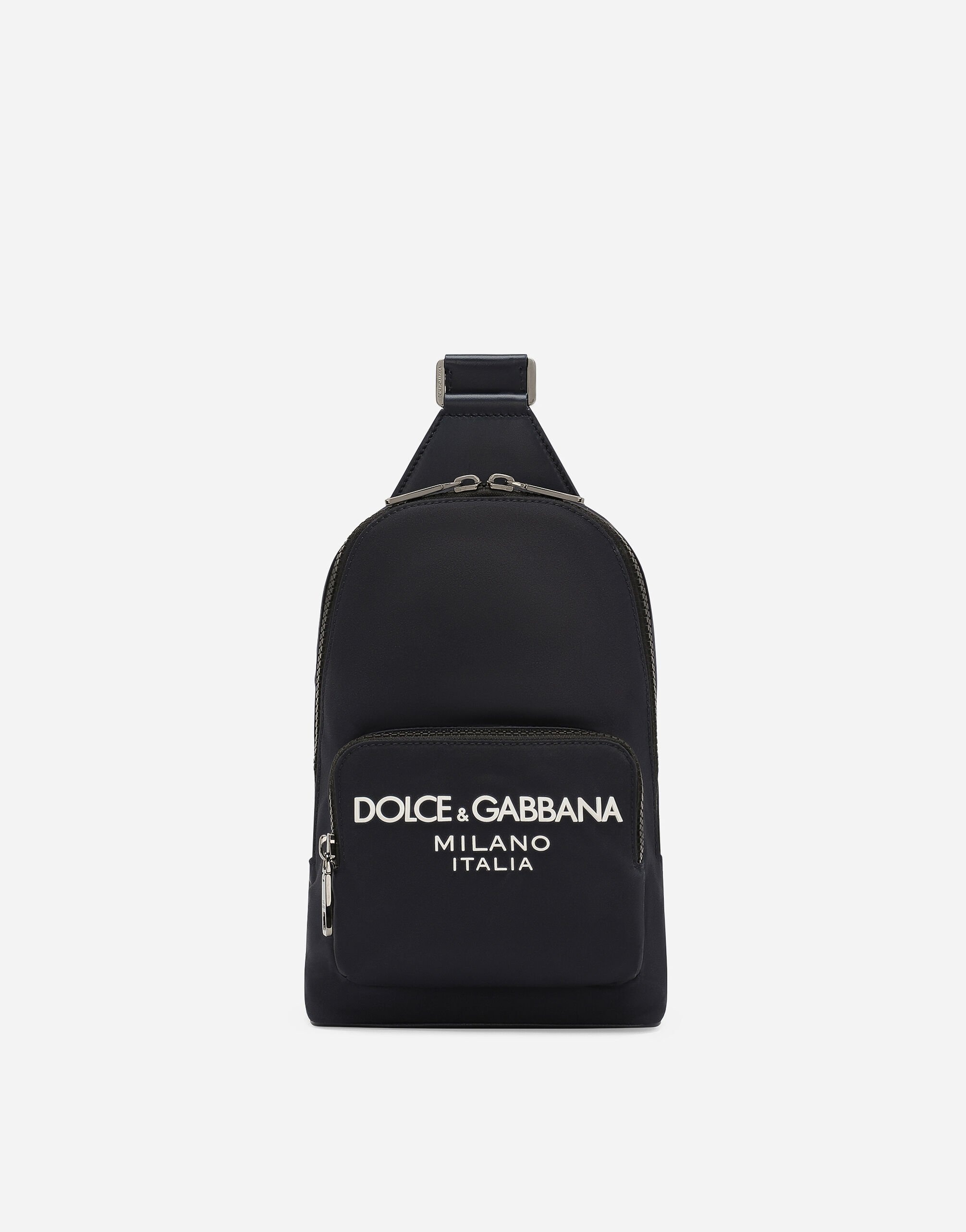 Practical and versatile, this new crossbody backpack comes in nylon with the rubberized Dolce&Gabbana Milano logo. Nylon crossbody backpack with rubberized Dolce&Gabbana Milano logo: • Blue • Top fastening with double zipper and slider with logo • Back pocket and front pocket with zipper and branded sliders • Adjustable tape strap with calfskin details • Nylon lining and zipped pocket • Item comes with a branded dust bag • Measurements: H25 x W16.5 x D8 cm • Made in Italy External composition: 50% Polyamide 20% Acrylic 15% Viscose 15% Calfskin Internal composition: 70% Polyamide 20% Acrylic 10% Calfskin
