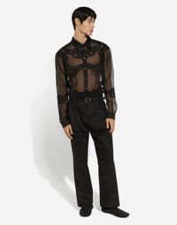 The SS24 “Stile” Collection recounts and clearly presents a strong concept: the unique and unmistakable style of Dolce&Gabbana. A word that is more than a statement. It is a concept! The designers work with surfaces, textures, layers and color nuances, as well as the sheen and fineness of the materials themselves, creating a “Stylish” collection. We’re going back to our roots with the desire to reaffirm the “Stile” - style -, flair and iconic DNA of the brand. Silk organza shirt with lace inserts: • Black • Oversize fit • Kent collar • Long wide sleeves • Double turn-up cuffs with buttons • Button fastenings • The piece measures 80 cm from the rear collar seam on a size IT 40 • Made in Italy External composition: 55% Cotton 30% Silk 15% Polyamide