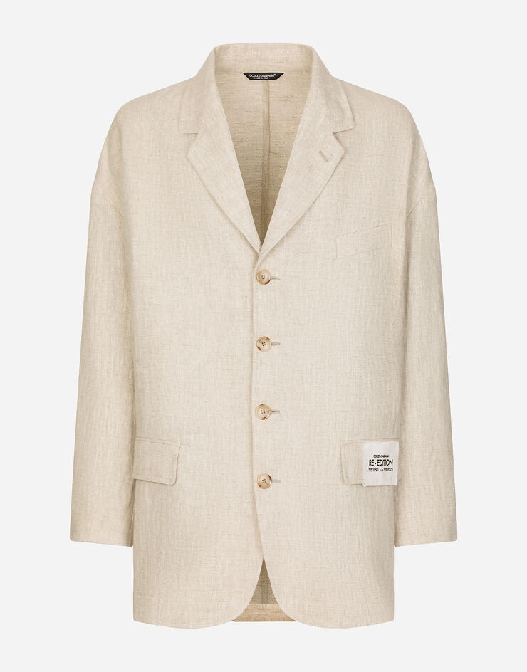 Deconstructed single-breasted jacket in linen and viscose with the Re-Edition label: • Oversize fit • Notched lapels • Button fastenings on the front • Outer flap pockets and breast pocket • Buttoned cuffs • Central vent • Lined • The piece measures 83 cm from the rear collar seam on a size M • The model is 185 cm tall and wears a size M • Made in Italy Care And Details External composition: 100% Linen Internal composition: 100% Cotton