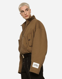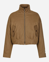 Short padded high-neck jacket in washed stretch cotton drill with the Re-Edition label: • Brown • Wad padding • Regular fit • Front zipper fastening • Outer flap pockets with buttons and zipped welt pockets on the interior • Darted hem with toggled drawstring • Quilted contrasting-colored flannel lining • The piece measures 60 cm from the rear collar seam on a size IT 48 • The model is 185 cm tall and wears a size IT 48 • Made in Italy Care And Details External composition: 98% Cotton 2% Spandex Internal composition: 75% Cotton 25% Polyester