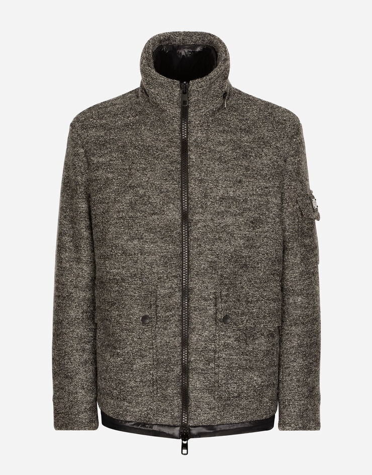 Padded high-neck jacket in bouclé-effect wool with metal tag featuring the Dolce&Gabbana logo: • Gray • Light insulated padding on the interior • Regular fit • Hood in collar • Front zipper and nylon front panel • Outer patch pockets with press-stud buttons and zipped welt pockets on interior • Patch pocket on the sleeve • Adjustable drawstring hem • Quilted lining • The piece measures 72 cm from the rear collar seam on a size IT 48 • The model is 185 cm tall and wears a size IT 48 • Made in Italy Care And Details External composition: 90% Virgin Wool 10% Polyamide Internal composition: 100% Polyamide