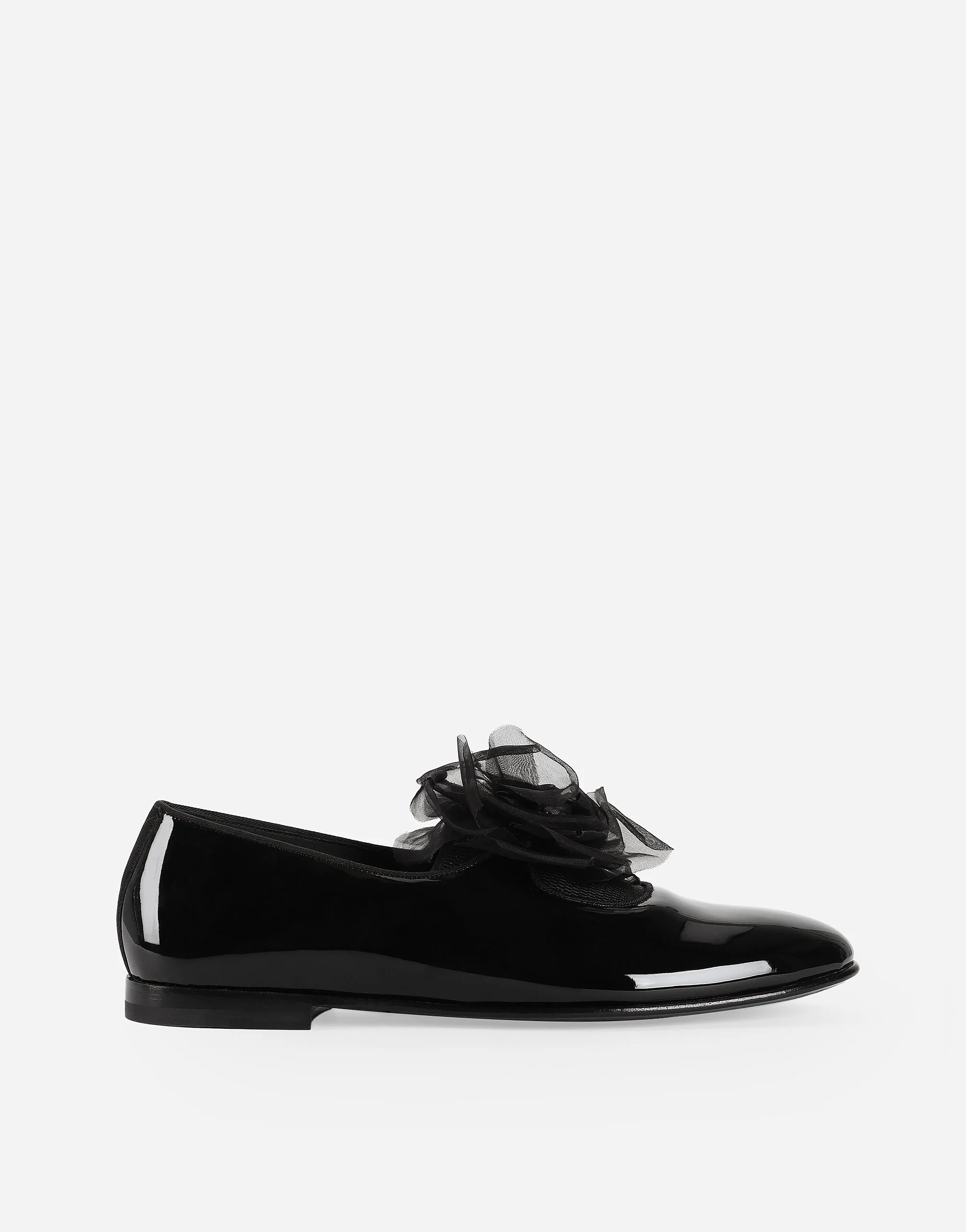 Elegant and sophisticated, these new DG Evening slippers come in patent leather with gros-grain trims and organza flower embellishment. Patent leather slippers with organza flower: • Black • Calfskin insole with branded label • Branded leather sole • Item comes with a branded dust bag • Made in Italy External composition: 100% Calfskin Internal composition: 90% Lambskin 10% Goatskin