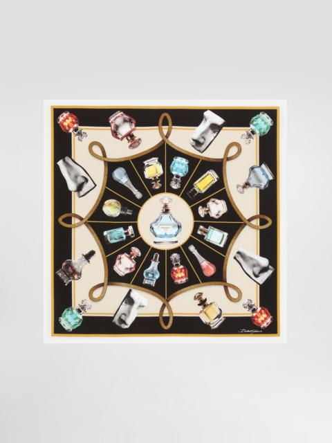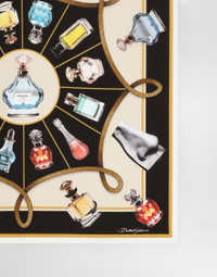 The Italian Holiday Men's Collection revisits 1950s style with a blend of relaxed fits and modern flair. Classic white shirts and tailored suits in refined fabrics contrast with casual denim and playful T-shirts featuring retro graphics with a futuristic twist. Bold prints—chessboards, cats, elegant lighters, and Mediterranean blue ribbons—alongside logo jacquard inspired by ties, infuse a contemporary edge into the essence of Italian holidays. Silk twill scarf with perfume print: • Multi-colored • Measurements: 70 x 70 cm • Made in Italy The difference in the print placement that you may find on this product is a feature of Dolce&Gabbana’s “Handmade” pieces. A detail that makes every garment or accessory unique and exclusive. External composition: 100% Silk