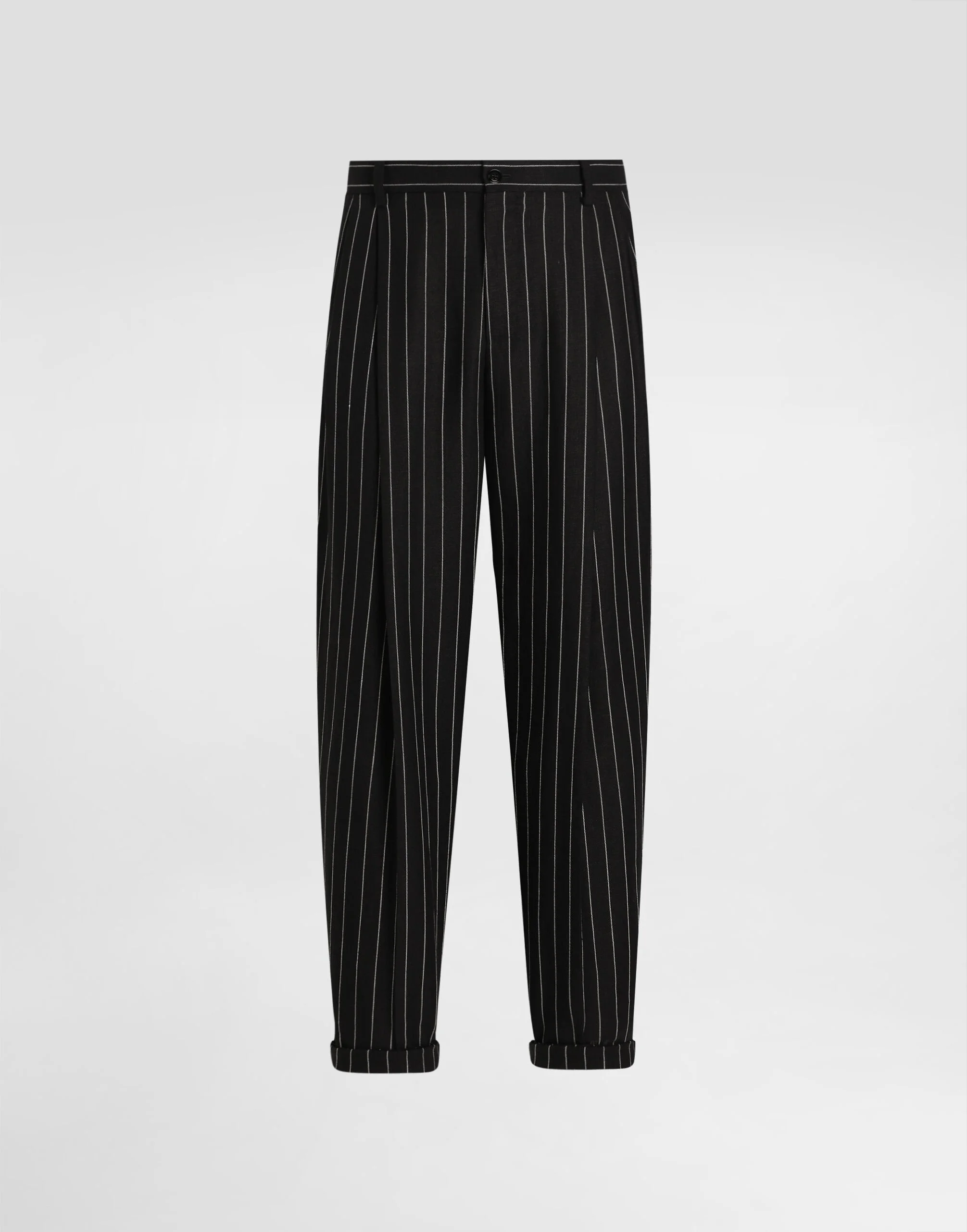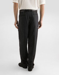 Italy and its beauty are reflected in the Men’s SS25 Collection. Woven raffia and leather give life to jackets, polo-shirts and sweaters to celebrating Italian craftsmanship. The color palette ranges from Nero Sicilia black to burgundy, contributing to conveying a sense of eternal elegance. Refined accessories complement the look: belts and loafers with hand-finished details and oversize bags, such as the Sicily, the Marlene with crocodile-effect print and the versatile Adamo tote. Pinstripe linen-blend pants with double darts: • Black • Regular fit • Belt loops on the waist • Fly-covered zipper and button fastening • Front slant pockets and buttoned welt pockets at the back • The item measures 100 cm on the outer leg and the hem is 18 cm wide on a size IT 48 • Made in Italy External composition: 52% Linen 48% Virgin Wool Internal composition: 76% Acetate 24% Silk