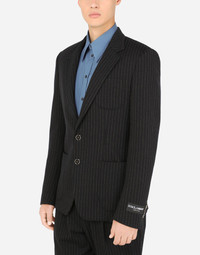 Deconstructed single-breasted jacket in stretch pinstripe jersey with the Dolce&Gabbana logo label on the cuff. • Regular fit • Notched lapels • Double-button fastening on the front • Outer patch pockets, two welt pockets on the interior • Buttoned cuffs • Central vent • Unlined • The piece measures 73.5 cm - 28.9 inches from the rear collar seam on a size IT 48 • The model is 185 cm - 72.8 inches tall and wears a size IT 48 • Made in Italy Care And Details External composition: 66% Viscose 27% Polyamide 7% Spandex