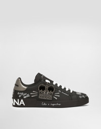 Featuring an understated shape, these iconic Portofino sneakers come in 100% calfskin nappa and boast a distinctive branded spoiler. Digital-print Portofino calfskin sneakers with embroidery, studs and crown patch embellishment: • Black • Flat laces • Calfskin footbed with branded label • Rubber bottom with branded spoiler • Branded rubber sole • Item comes with a branded dust bag • Made in Italy External composition: 80% Calfskin 5% Polyester 5% Glass 5% Silk 5% Brass Internal composition: 50% Lambskin 35% Goatskin 10% Polyester 5% Natural Rubber